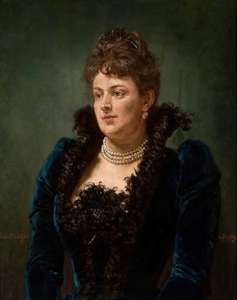 Editor: This is "Portrait of Olga von Grunelius," an 1872 oil on canvas by Franz Xaver Winterhalter, currently held at the Städel Museum. I'm struck by the subject's gaze and the way her clothing seems to float around her. It's so delicate. What do you see when you look at this painting? Curator: I'm immediately drawn to the formal qualities of Winterhalter's brushwork, specifically his deft handling of light and shadow to create a sense of depth. Note how the composition is built around the interplay between the oval frame and the sitter's internal curves, her shoulder line mirroring the curve of her face. It creates a certain harmony, wouldn't you say? Editor: Yes, I see what you mean about the curves now. It's like a visual echo. But what about the colors? Does the muted palette signify anything specific? Curator: Indeed. The palette, predominantly cool blues and greys, is strategically employed. Notice how Winterhalter modulates the tones within these colors. The subtle gradations in the blue fabric and the grey background generate an atmosphere of controlled elegance. The stark contrast of the black choker against her skin serves to further emphasize the sitter's complexion, and the jewel dangling on her necklace is quite arresting. Are you picking up on any other relationships between the colours, textures, and light? Editor: Well, now that you mention it, the translucence of her shawl contrasts nicely with the solidity of her skin. It's quite skillful. Curator: Precisely. These visual relationships, this structured orchestration of form, color, and texture, constitute the core meaning of the work, irrespective of historical or social contexts. Editor: I never considered how much could be interpreted simply by observing the interplay of forms and colours themselves. Thank you for offering that viewpoint. Curator: And I, in turn, appreciate your eagerness to see beyond the surface and delve into the work's underlying formal logic.