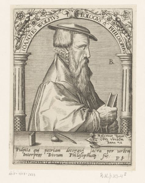 Robert Boissard created this engraving, titled *Portret van Hiëronymus van Praag*, sometime between 1586 and 1691. The print depicts Hieronymus of Prague, a Czech theologian and follower of Jan Hus, who was burned at the stake for heresy in 1416. Boissard created this print during a time of religious conflict in Europe, with the rise of Protestantism challenging the authority of the Catholic Church. Hieronymus, a figure of resistance against religious oppression, is framed here as a martyr. His direct gaze and raised hand gesture suggests defiance, as does the inscription, which translates to, "He who you burned, divine Luther, this was Hus himself." The print not only commemorates Hieronymus but also aligns him with the Protestant Reformation. The choice of Hieronymus as a subject reflects the ongoing struggles for religious freedom and the ways in which historical figures were invoked to legitimize contemporary political and religious movements. Boissard’s print creates a powerful statement about faith, resistance, and the enduring legacy of those who challenge established power.