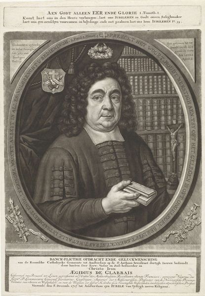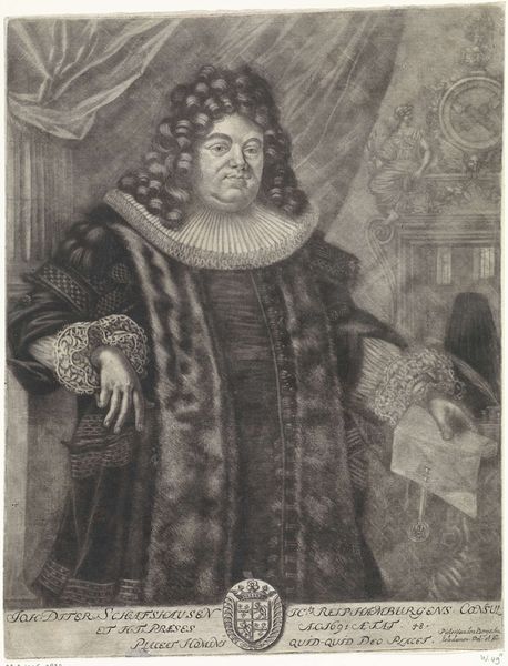 Curator: Immediately, I'm struck by a sense of theatrical heaviness—all those textures pressed into grayscale. It feels opulent and confining, somehow. Editor: Indeed. This is "Portret van Johann Dietrich Schaffhausen," an engraving created in 1691 by Pieter van den Berge. You can find it here at the Rijksmuseum. Its style reflects the Baroque period, doesn’t it? With its ornate detail and sense of drama? Curator: Absolutely. It’s so relentlessly detailed that it verges on the grotesque. Look at that ruff, or the folds in his fur-lined robe. They aren't just descriptive; they communicate status and power in a somewhat smothering way, almost like armor. And that knowing smirk! What do you think the story is here? Editor: The composition employs a strong diagonal axis, guiding the eye from the top left, with its dramatically draped curtain, to the bottom right, where the sitter’s hand firmly grasps a document, which may represent a charter or grant. This linearity emphasizes his position within a system, his importance reinforced by heraldic symbolism. The whole is framed by decorative, architectural elements. Curator: So, not just portraiture, but historical staging. His face, though, almost gets lost in the elaborate attire. There’s a real tension between the desire to impress and a vulnerability that slips through despite it all. I’d almost say you can feel what it was like to live in that time period. Editor: You touch upon a vital point about Baroque portraiture. The aim wasn't only likeness but the embodiment of specific virtues, power structures and personal narratives. Think of that column detail and sculptural form that almost echoes him in marble. It signifies a certain kind of permanence that can easily seem antiquated, and it may be easy to see some anachronism to all of that even in its own time period. It invites our introspection, after all, and perhaps makes that all but necessary. Curator: An apt summary! Thank you. Editor: The pleasure was mine. I hadn’t noticed those sculptural details until you pushed us there.