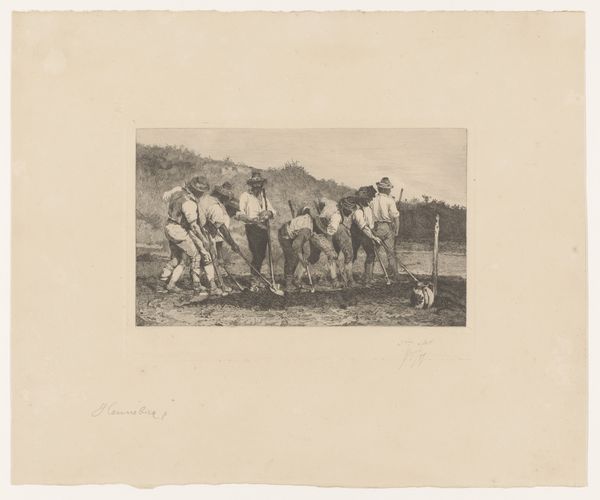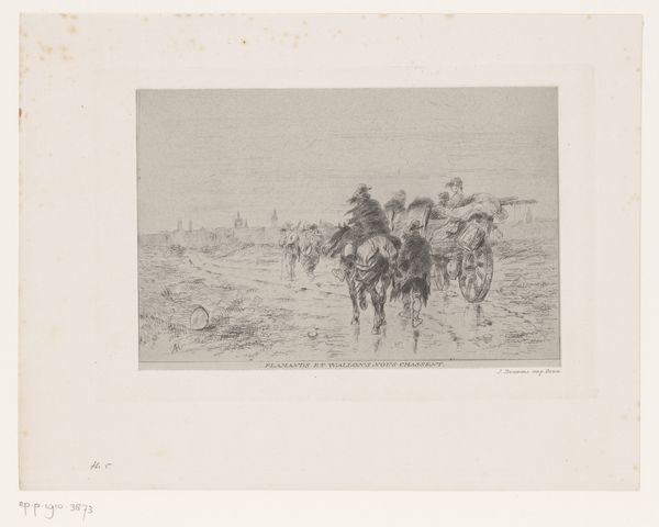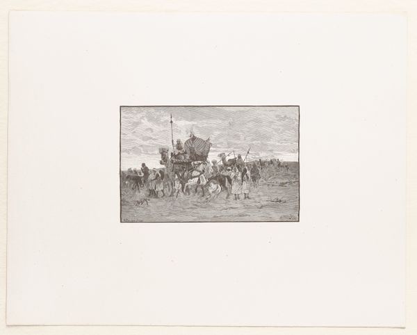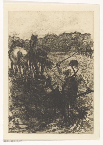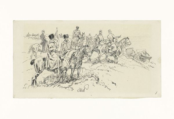John-Lewis Brown's etching, Cavalier, presents us with a scene dominated by a mounted figure, observed from the rear. The monochromatic palette and the textural richness achieved through the etching process immediately draw the eye. The composition, a careful balance of dark and light, evokes a sense of depth despite the print's small scale. Brown uses line and form to create a visual hierarchy. The Cavalier and his steed command the center, their forms solid and defined. The figures attending to the horse are rendered with a looser hand, and a diffusion in the background suggests a world beyond immediate clarity. The etching’s materiality, with its textured surface and tonal gradations, enhances the narrative, inviting us to consider the interplay between visibility and concealment. Brown's mastery lies in his ability to suggest narrative and mood through the deployment of form and texture.