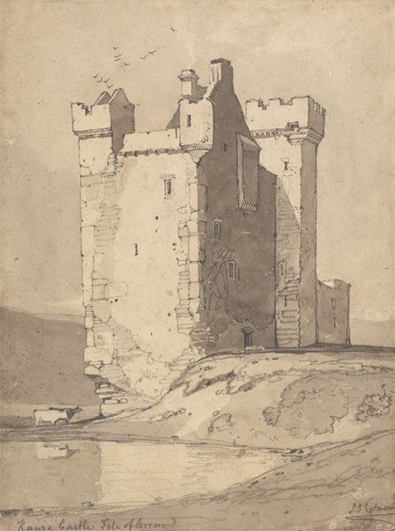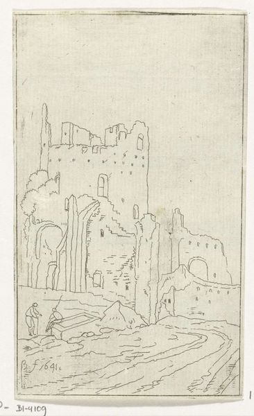 Anthonie van den Bos created this etching titled 'Ruïne' sometime in the late 18th or early 19th century. Its sepia tones lend a melancholic air to the crumbling architecture, evoking a sense of nostalgia. The composition is structured around the verticality of the ruin, contrasted by the horizontal lines of the landscape. The diagonal lines of the figures in the foreground lead the viewer's eye towards the architectural decay. The etching technique captures a range of textures. Smooth surfaces give way to rough, broken edges, highlighting the effects of time and the sublime power of nature to reclaim human constructions. This focus on ruins reflects a broader cultural interest in the Romantic era, questioning the permanence of human achievement, engaging ideas of transience and decay. The detailed rendering and tonal contrasts transform the ruin from a mere depiction into a symbol of existential reflection.