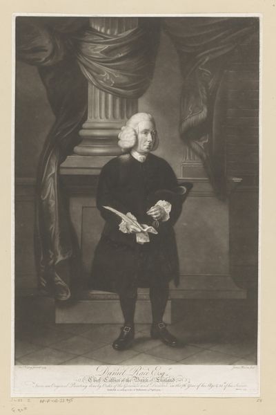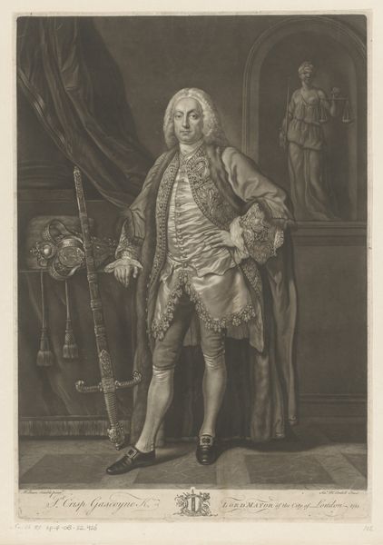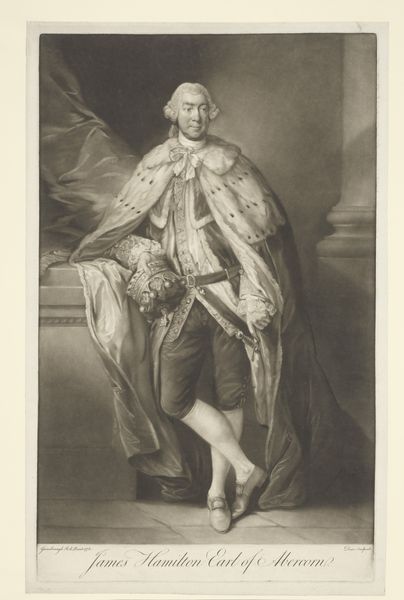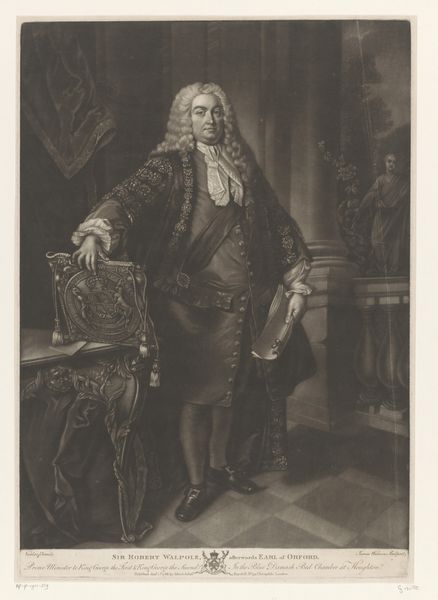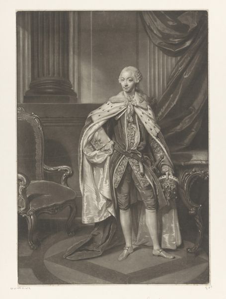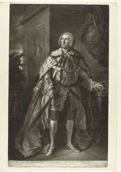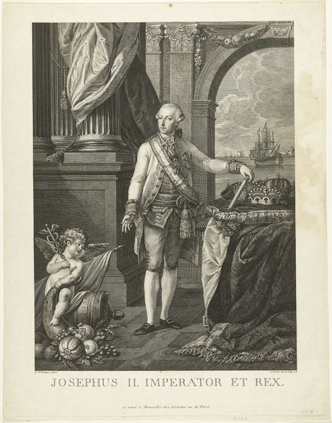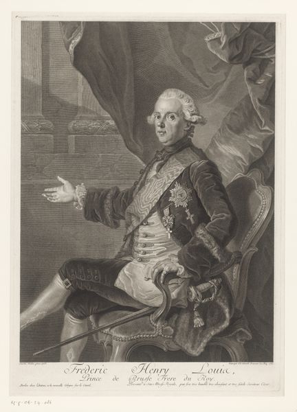 Curator: So, this print by Thomas Watson, dating from about 1774-1775, depicts Prince Henry Frederick, Duke of Cumberland and Strathearn. It's currently housed here at the Rijksmuseum. Editor: Immediately, what strikes me is this contrast between the opulence of the Duke’s attire and his rather blank, almost forlorn expression. It’s a really curious emotional discord. Curator: That's a fascinating observation. His clothing is clearly meant to convey status—the robes, the insignia, the feathery hat—but you’re right, there’s a distinct lack of warmth or genuine presence. It’s a very stylized representation, conforming to conventions of aristocratic portraiture. Editor: Absolutely, the symbols are almost shouting for attention: The architecture framing him speaks of power, and even the landscape painting seems like a carefully curated backdrop. Do you think this level of staging hints at a certain…insecurity, perhaps? A need to over-emphasize the external markers of his rank? Curator: Perhaps. Or maybe it speaks to the role that portraiture played at the time: less about capturing the individual soul and more about solidifying a dynastic narrative. Note, too, how precisely rendered his garments are—Watson excelled in capturing such textures using the engraving technique. Editor: And textures themselves carry symbolism, don't they? The sheen of his robe, the fluffiness of the feathers… they all amplify the Duke's visual "worth". One wonders what stories the family crest and each individual medal could tell. The engraver seems quite deliberate in capturing the fall of light upon each object, which does hint to some personal touch embedded within tradition. Curator: Indeed. The play of light helps give a sense of volume and grandeur. The piece follows Baroque traditions, yet has a starker sensibility compared to earlier masters, signaling evolving aesthetics of nobility at this moment. It is also interesting to remember the context, which includes increased commercialisation of artworks, meaning such images where reaching wider audience that just aristocrats. Editor: It certainly provokes thoughts about how individuals and identities are fashioned – literally and figuratively. I wonder about Henry's feelings about being displayed this way, or who ordered such work? A puzzle to the soul and mind for our audience, isn’t it? Curator: A truly great visual record raises more questions than it answers, doesn't it? It’s in this ambiguity and careful deliberation of representation, this push and pull between reality and constructed image, that we discover fresh meaning each time we revisit it.
