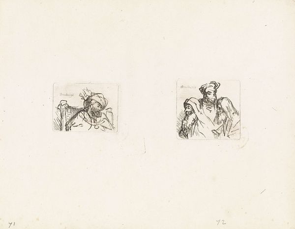 Editor: Here we have Moses ter Borch's drawing from between 1659 and 1661, titled "Maaltijd te Emmaüs, Heilige Hieronymus en de Presentatie in de tempel," made with ink on paper, and held at the Rijksmuseum. The three distinct panels create a sense of visual separation, like peering into different rooms. What compositional elements stand out to you in unifying this multi-scene artwork? Curator: The structure of the artwork commands attention. The division into three distinct scenes is key. Note the contrasting handling of light and shadow. The leftmost scene possesses a stark tonal range achieved through the medium of ink, almost mimicking chiaroscuro effects reminiscent of the Italian Baroque. While, to the right, more diffused lighting creates subtle tonal modulations and aerial perspective. The contrast encourages a reading that considers each panel individually and as a series. How does the use of line function to organize this triptych format? Editor: The lines vary in thickness and intensity; the weight seems to define space and form differently in each panel. Is it a change of technique, or does it denote something deeper? Curator: Precisely! Examine the deliberate variation. In the 'Emmaüs' scene, bold strokes build form with clarity. Contrast this with the more ethereal rendering of the central 'Hieronymus'. Here, Ter Borch manipulates line not merely as contour, but as a tool to create depth and atmosphere. It seems the intention is to invoke, perhaps, differing states of worldly being and states of heightened religious emotion or spirituality. Observe how this atmospheric contrast interacts with the other formal elements to invite various interpretations. Editor: I see what you mean now; line and contrast together. Thanks, I’m starting to consider the intentionality in each section’s composition beyond just subject matter. Curator: And seeing that, the real revelation may be in seeing the interplay, as well. It allows for a deeper analysis that considers how form shapes meaning.