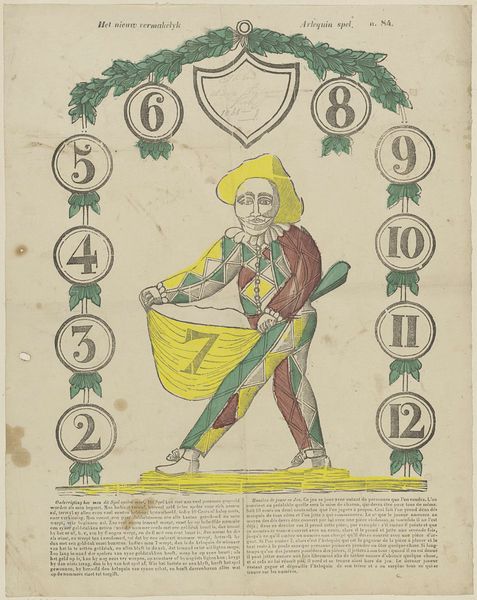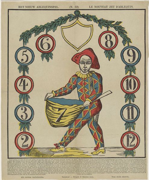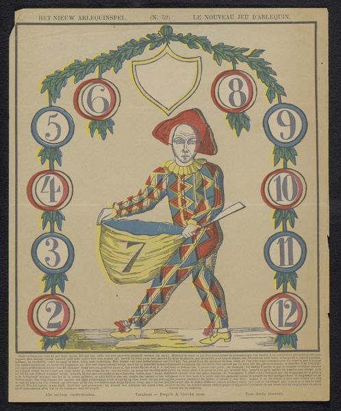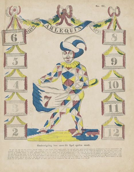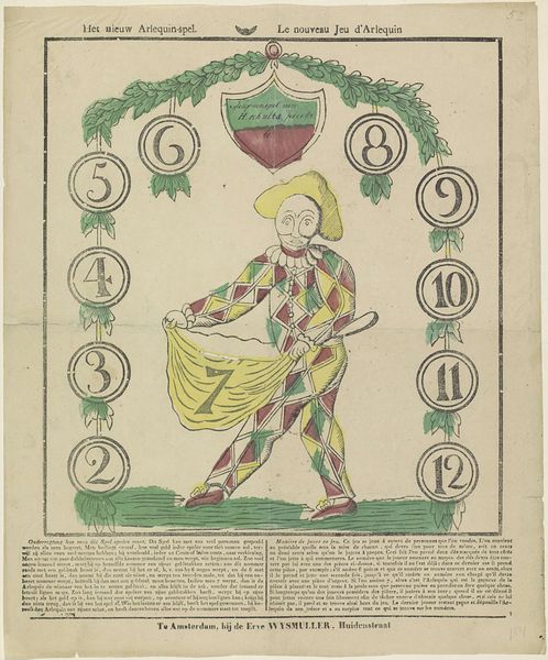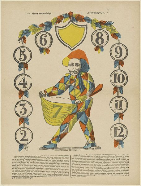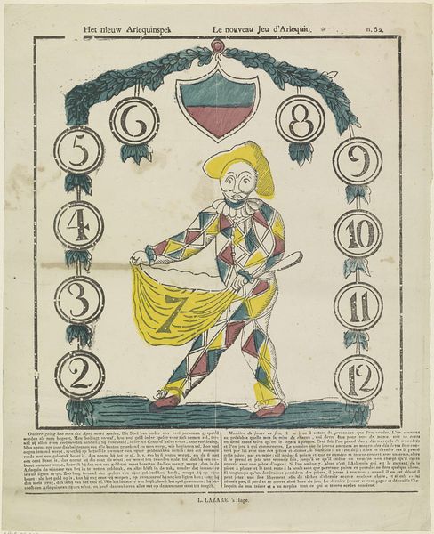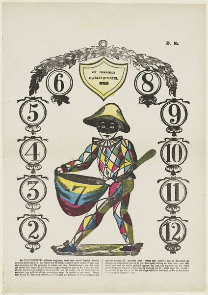 Aron Hijman Binger, made this print of ‘Het nieuwe Arlequin-spel’, a game sheet, using woodcut and letterpress techniques. The interplay between material and process here is fascinating. The woodcut lends itself to bold outlines and flat areas of color, ideal for the stylized figure of the harlequin and the game's numbered spaces. The letterpress ensures the rules of the game, printed below the image, are legible and precise. The very nature of printmaking invites a kind of social engagement, creating multiples that circulate widely. These game sheets would have been relatively inexpensive, making them accessible to a broad audience. This speaks to a democratizing impulse, using the means of production to bring leisure and entertainment to the masses. In a time before mass media, printed games such as this offered shared experiences but were also ephemeral objects of everyday life, often discarded and now made precious by survival and display in a museum.
