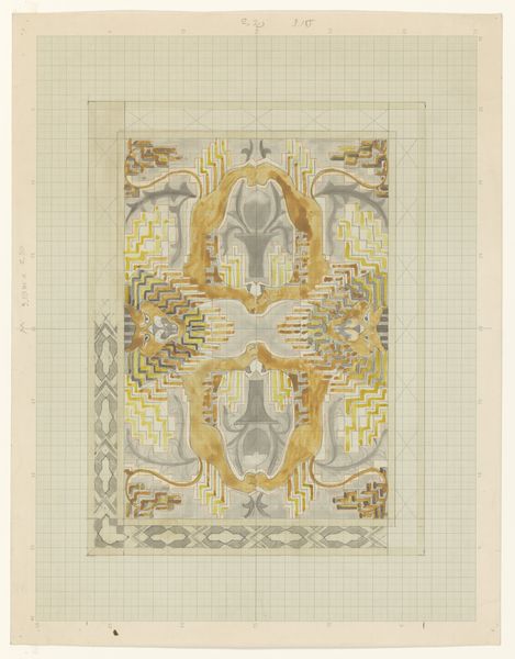 Editor: This is "Ornamentaal ontwerp met leeuwen," an ornamental design with lions, by Carel Adolph Lion Cachet, made sometime between 1874 and 1945, using pencil and drawing. It looks like a study for some kind of larger work, maybe a tapestry or something similar. What grabs me is how the lions are both ferocious and yet strangely decorative. How would you interpret the design of this piece? Curator: This design presents a fascinating study in structure and line. Note the symmetry: the lion motifs are mirrored and repeated to create a balanced framework. Consider, too, how the artist uses the grid to structure the design; the grid becomes a fundamental aspect of its composition. Does this reliance on the grid indicate anything about Cachet's methodology or intentions? Editor: I hadn't really considered the grid. So it's almost like the grid is part of the composition? It's usually underneath, right? I mean, you don't see it in the final work, right? Curator: Indeed. Now, observe the nature of the lines themselves. They are not simply outlines but contain varying weights and densities. Also consider the space that contains them – how does the open space contribute to your interpretation? Editor: I guess it makes me wonder whether those blank sections would be filled in with different colours or textures. Curator: Precisely. This interplay between positive and negative space, line, and potential colour reveals much about Cachet’s formal considerations. Does it tell you something about the relation of function to representation? Editor: Well, looking at this through your lens definitely emphasizes its underlying construction. Thanks for revealing some fresh eyes to me! Curator: A pleasure. Paying attention to the materiality and structure helps decode the artistry and intentions behind a work, whether the artist foregrounds these choices or leaves them hidden.