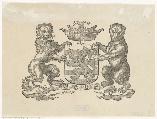 This striking print was made by the widow Gijsbert de Groot, and it’s a great example of a woodcut, a process where an image is carved into a block of wood, inked, and then printed onto paper. The material qualities of the woodblock strongly influence the print’s appearance. Notice the bold lines and flat areas of color which are typical of the technique. The lion rampant on the shield, the drummers with their instruments, and the stylized tree - all these elements are rendered with a graphic clarity. The production of a woodcut like this was labor-intensive, requiring the skills of a trained artisan to carve the block accurately. In its time, this method allowed for relatively quick production and dissemination of imagery, contributing to a wider visual culture. The print’s symbolism of heraldry, military figures, and accompanying text highlight its social context, offering insights into the values and concerns of the time. Considering the material, making, and context of this print encourages us to appreciate its full meaning, challenging traditional distinctions between fine art and craft.