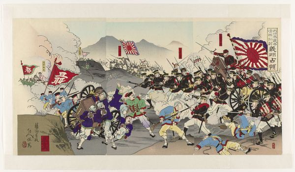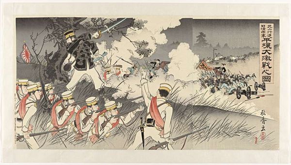 Utagawa Kunitora created this woodblock print titled "Enemy Ships Deterred at Haiyangdao" in nineteenth-century Japan, a time of internal reform and external conflict. In this work, Kunitora depicts a naval battle, showcasing Japan’s military prowess. We see dynamic lines and vivid colors that capture the intensity of the scene, with Japanese ships firing upon enemy vessels amidst turbulent waves. However, beyond the surface, this print speaks volumes about identity and cultural narratives. Kunitora presents a romanticized view of war and the heroic depiction of Japanese soldiers, reinforcing a sense of national pride and unity. The print also reflects the complex relationship between Japan and the outside world, particularly Western powers. The composition and style are steeped in artistic tradition, yet the subject matter points to a nation grappling with its place on the global stage. What emotional responses does this heroic interpretation of war evoke in you?