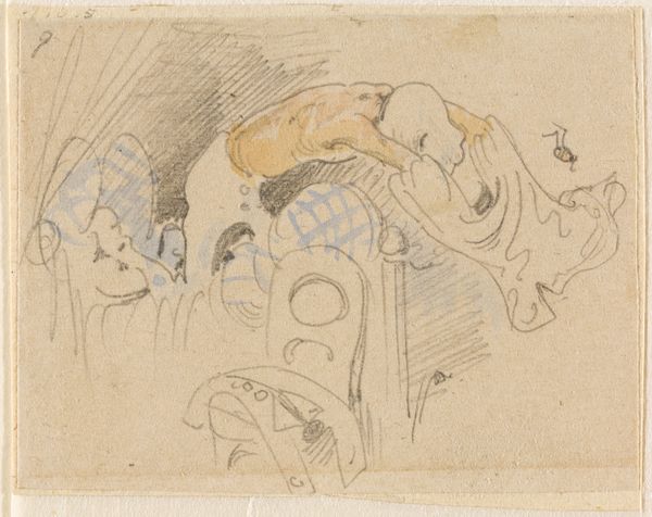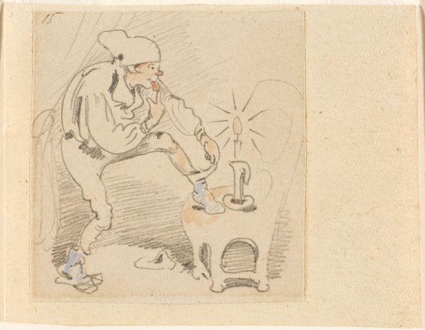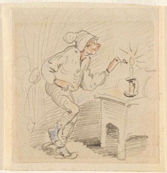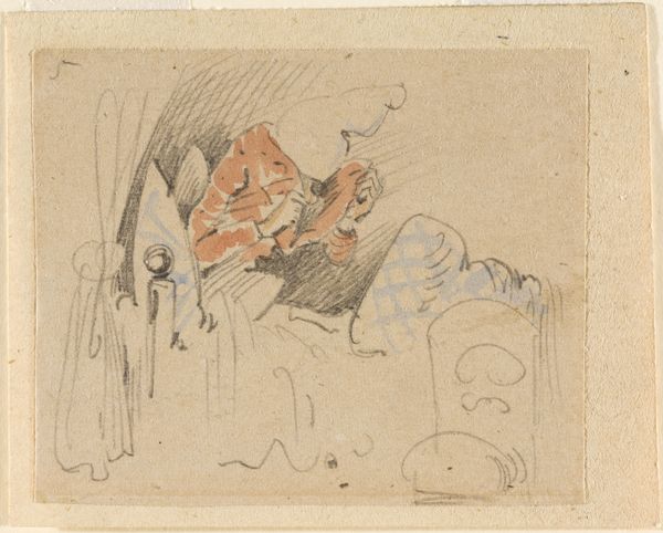 Curator: This drawing, sketched around 1862, comes from the hand of Wilhelm Busch. He titles it rather wonderfully "Die gestörte, aber glücklich wieder errungene Nachtruhe (Der Floh); 12"—"The disturbed, but happily regained night’s rest (The Flea); 12." It’s currently housed in the Städel Museum. Editor: Well, "happily regained" seems to be stretching things a bit. The poor chap looks more like he's escaping a raging fire than enjoying a peaceful slumber. It is so interesting how caricature, can sometimes just reflect reality in such a potent, poignant, way. Curator: Busch, you know, had this incredible way of blending the everyday with the absurd. He taps into this middle class frustration in such an intimate and funny way. His caricatures of contemporary life can often carry a stinging sociopolitical commentary. I guess you could almost describe him as an angry idealist. Editor: An angry idealist, armed with a flea bite, perhaps? You’re right though; beyond the humor, you sense this deeper critique of societal expectations. That little, bedraggled figure—is he meant to be us? I mean look at how the composition frames his vulnerability within domestic confines. It’s both intimate and, unsettling, wouldn't you agree? Curator: Absolutely. There's also something beautifully simple about Busch's style. He just relies on loose strokes, he suggests, he implies... like the man's tiny porcelain pot! He manages to convey so much about emotional states and narrative using these deceptively simple means. Its deceptive, its deep and complex, wouldn't you say? Editor: I would! But more importantly, there is no barrier between that sketch and my appreciation of it! It seems to capture a universally awkward human truth about how external forces constantly invade, distract and, interrupt and ultimately define so many aspects of our supposedly unique identity! Flea as an metaphor for culture and the forces it brings to bare on the poor, individual, defenceless night sleeper perhaps... It is an invitation for empathy if ever I saw one! Curator: Perhaps, it even leaves me wondering, maybe the key to truly understanding society isn’t just through grand histories, but these very human moments. Editor: It may very well be a window, you're right, or maybe it just gives me the willies. Anyway it made me see society today, and my place in it, a little more clear, with all the itches!