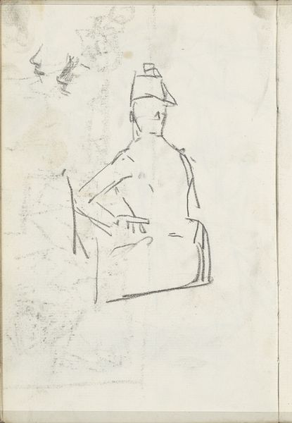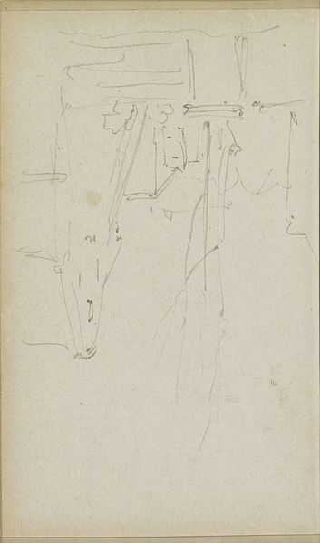 Curator: Here we have George Hendrik Breitner's "Two Studies of a Standing Woman," a drawing from around 1882 housed at the Rijksmuseum. Editor: My immediate impression is of something fleeting, like a snapshot caught in charcoal—a study of movement and form reduced to its barest essence. Curator: Indeed, the loose lines, the sketchy quality—they reveal Breitner's process, his way of rapidly capturing impressions of everyday life. Note the material conditions here: inexpensive paper, a readily available pencil or pen. This speaks to the democratized production of art. He isn't meticulously crafting a formal portrait for the elite; rather, he's exploring the form of a woman likely working-class or middle-class. The means of production suggests a shift towards art reflecting the common person and experience. Editor: I'm drawn to the figure on the left. The hat creates a strong, geometric shape against the softer curves of her coat, a visual anchor within the composition. And on the other, notice the line implying the contour of the arms and the hands resting at her side, but only as much line as absolutely needed. He's getting to the essence. Curator: Exactly. And if we look at the social context of the time, this piece emerges during a period of burgeoning industrialization. Breitner was known for depicting the working classes and urban scenes—reflecting his concern for their welfare and his keen interest in depicting Dutch life at that period in time. His process echoes the speed and transience of the rapidly changing world around him. Editor: There is, however, also something timeless here, and deeply structural. Observe how the repetition of vertical lines in their clothing and stance creates a subtle rhythm that leads your eye up and down the composition. The contrast between the darker, more defined strokes and the faded ones also highlights elements such as the woman's fashionable hat. This shows more than a rapid attempt to represent women, there are decisions, it has a rhythm that structures the whole artwork. Curator: Ultimately, this piece grants us access to Breitner's working methods and thought processes. His artistic labor becomes evident, highlighting a departure from the traditional, polished artwork aimed at a high society and revealing how art may address the mundane concerns of everyday life. Editor: Well said. Breitner captures not just what they looked like, but an attitude toward form. Through a keen consideration of shape and placement he provides the essence of presence on the paper.