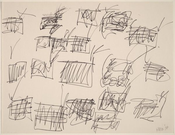 Editor: We’re looking at Rune Jansson’s "Genom fönstret" from 1961, a drawing made with pencil and colored pencil. It’s remarkably minimal and seems to be playing with layering. What strikes me is the contrast between the defined horizontal yellow lines on the left, and the denser vertical green strokes on the right. What do you see in this piece? Curator: The artist's use of pencil and colored pencil isn't simply about depiction, but about process. Consider the labor involved in creating those meticulously placed lines. Does the repetition reflect factory work? How does Jansson elevate such repetitive mark-making to art? It also challenges the distinction between high art and "mere" craft. Editor: That's interesting, I hadn't thought about the work involved on that scale. Do you think the “Genom fönstret” title – meaning “through the window” – alludes to looking *out* onto this type of industrial landscape, or is it looking *in* on that world of making? Curator: Perhaps both. The title complicates our understanding. It suggests observation, but from a position of implied separation. What does it mean to view labor and material production "through" something? Is the "window" a class barrier, a physical distance, or a deliberate artistic filter? This perspective inherently carries a socioeconomic lens. Editor: So you see this not just as an abstract image but as a statement about the means of production and how we perceive them? Curator: Precisely! By focusing on the materials, the process, and even the implied act of looking "through," we can uncover the societal currents subtly embedded within the abstraction. It pushes us to consider the world beyond the frame, the world of material reality that gives rise to the art object. Editor: That definitely makes me look at it differently, appreciating the deliberate choices that reveal a bigger message. Thank you! Curator: And thank you; these types of observations really drive the way we can analyze process and labor to extract more layered meaning!