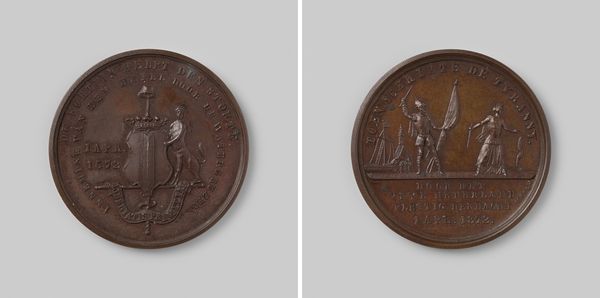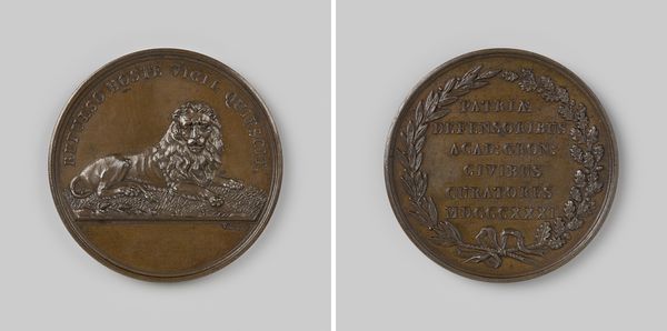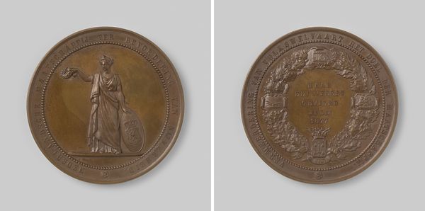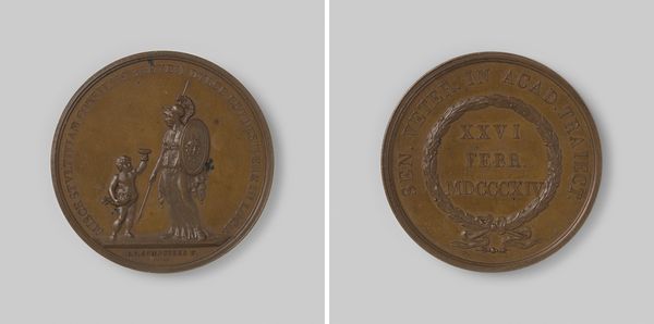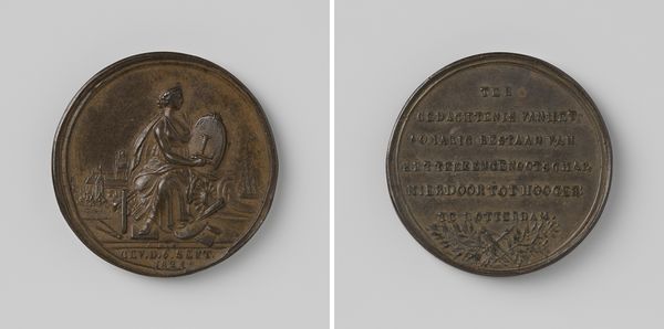 Curator: This bronze relief, currently housed in the Rijksmuseum, commemorates the fiftieth anniversary of the Nationale Nederlandsche Huishoudelijke Maatschappij in 1804. It's a medal by Johan George Holtzhey. The piece seems to embody the neoclassical style. What do you think? Editor: It strikes me as rather…optimistic, actually. The imagery feels idealized and evokes a sense of prosperity and societal harmony, doesn't it? There is something undeniably celebratory in the air here. Curator: Absolutely. We should contextualize that. These medals were often commissioned by institutions as public-facing markers of achievement, promoting certain civic virtues. What's fascinating is how institutions used neoclassical symbolism to craft these specific messages. Editor: Right. The choice of a classical aesthetic isn’t accidental; it reinforces the image of rationality and stability they're cultivating. This "Oeconomische Tak" translates roughly to "Economic Branch" - the predecessor of this National Dutch Household company was linked to The Dutch Society of Sciences. Can you elaborate on the symbolism here? Curator: Well, observe the figures on the obverse. You've got a figure placing a laurel wreath upon another who rests beside a beehive. These details tap directly into notions of industry, reward, and collective well-being central to the company's identity. It implicitly links the Maatschappij’s aims with a progressive vision for Dutch society. Note how this vision can be interpreted through a lens of inclusion, specifically by considering women. Editor: And is this reflected in its later activities? Curator: Exactly. Placing it within the context of early 19th century social reforms, specifically with regard to societal contributions that benefited from domestic and gender equality initiatives, we can then analyze how women gained financial awareness and greater financial equality within society and culture through its household practices. The emphasis on this association can provide deeper insights to modern female finance empowerment theories. Editor: I appreciate you drawing that to our attention, viewing this medal then, as not just a static artifact, but a touchstone for considering those emerging gender and power dynamics is invaluable. The piece prompts us to reflect critically on whose interests these celebrations of “prosperity” genuinely served, while acknowledging its progressive intent on women and home. Curator: Yes, history gives us many avenues into this intriguing piece, while your emphasis on a cultural dimension reveals new avenues.