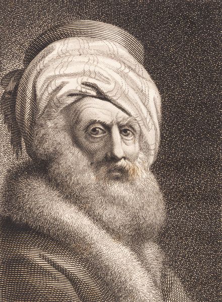 Curator: Francesco Hayez painted "Ephraim" in 1844. It’s an oil on canvas, and quite striking in its portrayal of the subject. Editor: Yes, arresting! There’s a somber quality to it, don’t you think? A feeling of introspection conveyed through the direct gaze and the rather muted palette. The soft modeling of the face, juxtaposed with the textures of the beard and turban. It is formally remarkable. Curator: The exotic garb is certainly intentional. Consider Hayez's Romantic era influences. He was engaging with history painting, but in a way that used costume and setting to signal difference. This could also point towards the impact that colonialism had on representing non-European sitters in art production at the time. Editor: Absolutely, it invokes that. Though the texture also provides a clear structural dynamism. Note how Hayez has positioned the turban's folds against the smoother drapery, and against the stark simplicity of the backdrop. It focuses one's vision to the narrative unfolding at the top of the picture. Curator: True. The turban certainly draws the eye; we can appreciate the artistic labor involved in such detailed work, particularly the implied costs associated with such materials and the skill needed for such precision in painting them. Hayez carefully renders its folds, while hinting at a certain symbolic association. Editor: Yes, and there's the implied direction indicated by his finger. I am interpreting it formally to direct my line of sight, as that hand seems to hold narrative potential by how much the texture creates motion throughout the piece's construction. Curator: Yes. I find myself reflecting on the means through which identities and social classes were performed and understood. Editor: "Ephraim" is truly a potent blend of artistic design elements. The formal dynamism between the man, turban, color balance, and structural construction continues to hold up after all of this time.