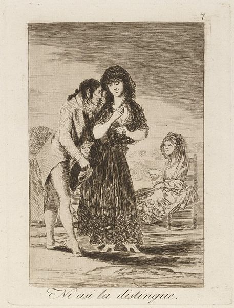 This print shows a soldier standing next to a woman seated beneath a gallows, created by Guillaume Joseph Vertommen. Vertommen lived in a time of great social change across Europe. His identity as a Belgian artist is important: Belgium was undergoing a period of cultural and national self-definition. In this image, a soldier appears to be in conversation with a woman, close to a gallows. The setting immediately invokes themes of justice, power, and perhaps despair. The woman, seated, seems vulnerable, while the soldier’s stance suggests authority, creating a visual dialogue about gender and power. The presence of the gallows looms large, symbolizing the ever-present threat of state-sanctioned violence and its disproportionate impact on the marginalized. Vertommen’s choice to depict such a scene invites us to reflect on the human cost of conflict and the subtle ways in which power dynamics play out in everyday life. It reminds us of the emotional and personal dimensions of historical events.