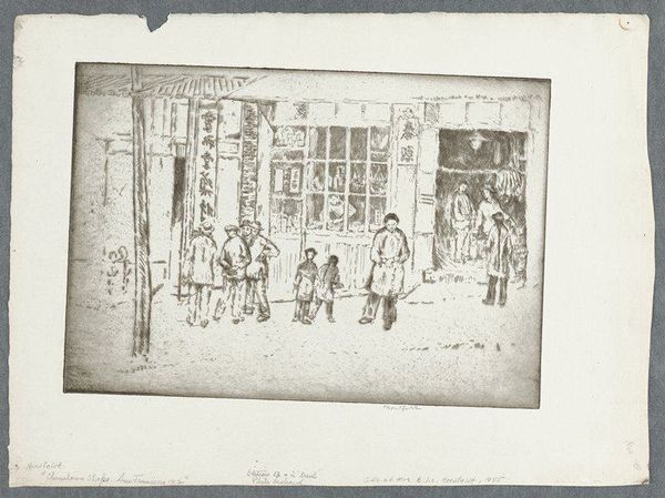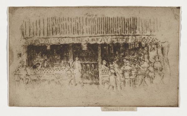 Curator: What a fascinating etching! This is Joseph Pennell's "Underground Bookstall (The News Stand - Charing Cross) London," created around 1890. Editor: There's a wistful quality to this work, like looking at a forgotten corner of the city. It's dreamlike, almost. Curator: Indeed. The hazy, impressionistic style obscures details while perfectly capturing the mood of bustling London life. Pennell masterfully uses etching to emphasize shapes and patterns, echoing familiar forms. Do you notice the arched structure looming above the people browsing for periodicals? Editor: That dark, almost oppressive archway does draw the eye! The framed placards on the wall call to mind the station of the cross. I notice many faces turned toward those publications, as if they held some kind of sacred revelation for their readers. Curator: It reminds us of the transformative power of news and literature during this period. In that respect, one could say the bookstall stands as a contemporary secular temple, the news agent as a priestly figure. Notice the repetition of circles above: light fixtures, signs. Circles symbolize wholeness, the cyclical nature of time, and, in this case, perhaps, the relentless news cycle. Editor: That circular symbolism is compelling, especially with the implied "temple" behind it! It gives the everyday transaction a sort of gravity, like history itself is for sale there. I imagine a cold day. I also can almost smell the coal smoke. What a strange idea—buying a little chunk of history every day. Curator: Yes, Pennell’s work offers us a fascinating insight into the intersection of commerce, culture, and the collective pursuit of knowledge in the heart of Victorian London. The underground newsstand becomes an arena where people gathered to consume not only news, but shared perspectives on the rapidly evolving world. Editor: It all makes you wonder about the stories held in those old papers... forgotten concerns, daily dramas that shaped lives we can only glimpse now. Curator: Indeed, each impression pulled from this plate revives a ghostly presence. Editor: Leaving us, like these readers, browsing for clues in the news.