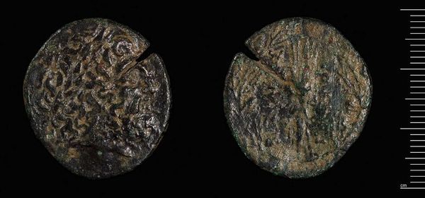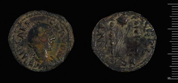 Curator: Here we have a coin minted in Patrai under Commodus. Editor: Its materiality is immediately striking; it feels aged, worn, like a tangible link to a distant, almost mythical past. Curator: The obverse presents a bust of Commodus, while the reverse possibly depicts a standing figure of a deity. The composition is circular, contained, self-referential even. Editor: This coin speaks volumes about labor, and the sheer physicality of its creation. The processes of mining, smelting, striking, and distributing these coins are worth considering. Curator: Indeed, and one can interpret Commodus's self-representation as an attempt to project power through the semiotics of portraiture. Editor: I see it as a testament to the countless hands it passed through, a humble object embedded in a vast network of Roman commerce and rule. Curator: Well, I'm left contemplating the coin's form and how it speaks to the ideals of the emperor. Editor: For me, it's a window into the labor and systems that underpinned Roman society.