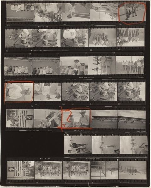 Robert Frank created "Guggenheim 590--San Francisco" using gelatin silver print. The piece presents a series of frames, each capturing slices of life in San Francisco. The arrangement is not linear, and not chronological, prompting us to make connections between disparate scenes. The high contrast and stark blacks and whites lend the work a documentary feel, yet the composition is far from objective. Frank’s use of shadow, light, and framing directs the viewer's eye. Each frame becomes a sign, a fragment that, when combined, suggests a narrative about American society. Children eating, a political protest, and daily life captured with a raw spontaneity. What’s intriguing is how Frank uses the film strip itself. The black bands separating each frame serve as a constant reminder of the act of capturing, editing, and curating reality. The images, therefore, should not be viewed as fixed representations of truth, but rather as constructions that challenge our understanding of photography.