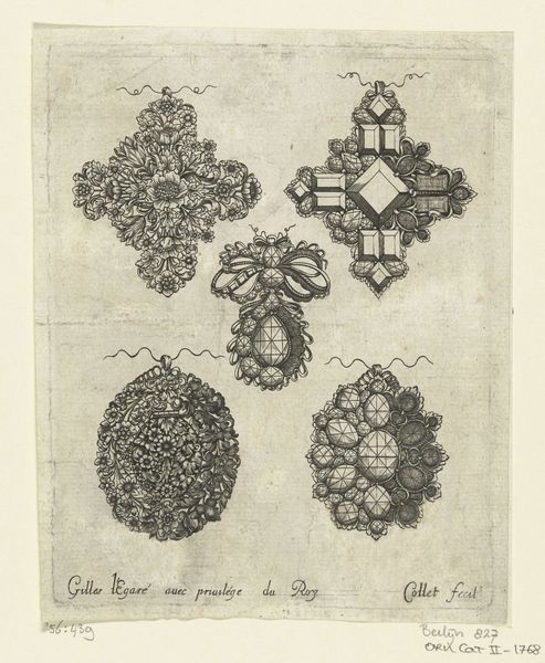 Louis Cossin created this undated drawing of jewelry designs with pen and brown ink, now held at the Rijksmuseum. The drawing presents five frontal and rear views of jewelry pieces, each meticulously detailed. Notice how Cossin uses contrasting forms; some jewels overflow with floral motifs, while others are defined by geometric precision. Consider the interplay between organic and inorganic shapes. The floral designs evoke a sense of natural abundance, contrasting with the structured clarity of the geometric patterns. This juxtaposition might reflect broader tensions of the period, caught between the Baroque's exuberance and the Enlightenment's order. In this drawing, Cossin destabilizes conventional approaches to jewelry design by presenting both front and back views. This approach invites us to think about jewelry not just as objects of display, but also as constructed artifacts with hidden structures and complex forms.