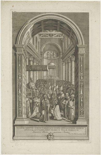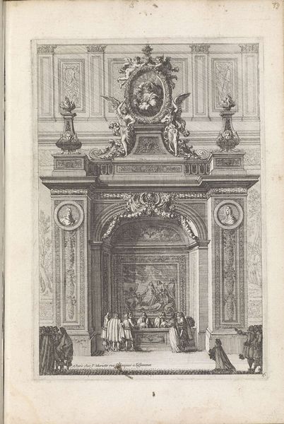 Editor: So, here we have "Gezicht in het schip van een kerk" by Jean Lepautre, made sometime between 1657 and 1665. It's an engraving, a print. I’m struck by the sheer detail and how ornate the architecture is, almost overwhelming. What's your take on this work? Curator: Well, let's consider this engraving not just as a representation, but as a product. Look at the labor involved in creating this level of detail using engraving tools. Each line, each flourish, is a testament to the engraver's skill and the time invested. This wasn’t a spontaneous act of creation, but a carefully planned and executed process rooted in the workshop. How do you think the Baroque style and the medium influenced each other in this case? Editor: That’s interesting. I hadn't considered the physical effort so much. It feels like the Baroque love of ornamentation has been completely translated into a medium that requires intense precision. So the architectural subject demands detail, but the engraving *produces* it, through labour and expertise. Curator: Precisely! Think about who this print was *for*. Was it accessible to the masses, or intended for a more privileged audience that could appreciate and afford such intricate work? The social context of production and consumption shapes the very meaning of the piece, don't you think? We are looking at an artwork but what we see is a whole history of human production and consumption tied into each line of the engraving, a system of patronage, production, and privilege! Editor: Definitely. It makes me think about the role of prints in disseminating images and architectural ideas at the time. So much effort expended for that goal. This discussion gave me a totally new way of perceiving it, not only considering its image, but how that image was laboriously and skillfully made. Curator: Indeed. Seeing art through the lens of materiality opens up entirely new avenues for interpretation and challenges the traditional canon by acknowledging the vital roles of labor, craft, and the socio-economic context in artistic creation.