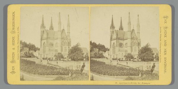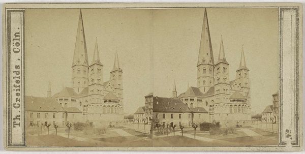 Curator: Welcome! Here we have a gelatin-silver print from between 1859 and 1875 by Theodor Creifelds, titled "Maria Hemelvaartkerk in Andernach, Duitsland"—or, in English, the Church of the Assumption of Mary in Andernach, Germany. Editor: It feels...staged, somehow? Like a play set, especially with the way the trees are almost formally arranged. There's a stillness, an almost theatrical silence about the whole thing. What do you make of the romantic sensibility in photography? Curator: The romantic movement certainly influenced the early days of photography, but through social documentation as photography became a tool for civic engagement. These early cityscapes often depicted public buildings like the Church for purposes of municipal and political power. Editor: So the staging I’m picking up on could be less artistic and more...official propaganda? I’m getting this weird, grand-yet-clinical vibe. There is an intent for the viewer to feel somewhat imposed upon. Curator: Exactly. Think about the moment in history; new technologies are rapidly changing society. This type of image presents a carefully constructed reality: order, stability, perhaps even a deliberate effort to project the Church as an unchanging bedrock in times of immense social flux. The photographer uses specific optics. Editor: What specific optical techniques did he employ? Curator: To construct his work, Creifelds uses techniques such as composition, light exposure and photo editing. Through precise control he's shaping how society saw the place of religion and the power of city institutions within German life. It is to emphasize certain narratives, rather than simple representation. Editor: Right! Now I can't unsee it. That initial, somewhat eerie feeling of the scene has intensified into a profound unease about what the image does, not what it shows. It goes far deeper than surface appearances, more than landscape views. It's history carefully curating a place for itself. Curator: Yes, it’s an orchestrated performance. By revealing this, photographs are more than artifacts. This is why, when discussing artworks from the past, it’s not just about what is visually there, but rather who is empowered to see it, and who are omitted from seeing. Editor: Profound stuff. Makes you think about every snapshot and filtered post, doesn’t it? It all screams: Look closely and be careful how you view the truth, when presented to you. Curator: Indeed, an excellent summation of the importance of historical views in our modern landscape! Thank you for taking this historical tour of "Maria Hemelvaartkerk in Andernach, Duitsland".