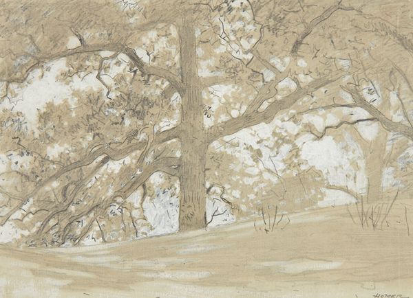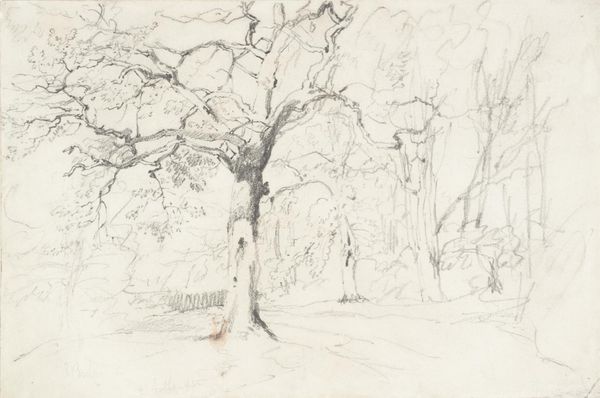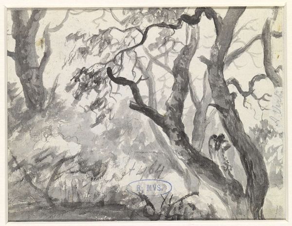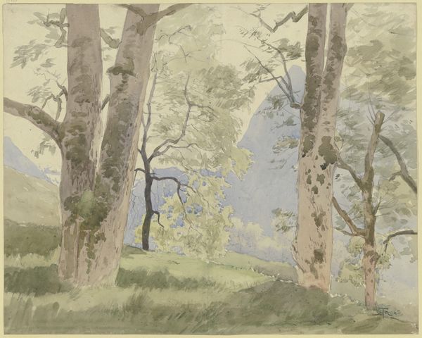 Curator: Ah, here we have Philip Wilson Steer’s "Farmyard." He made it in 1919. It’s a watercolor, very delicate. Editor: It's like looking through a veil! What strikes me first is the incredible softness, almost dreamlike. Curator: Steer was fascinated by capturing light and atmosphere. See how the trees frame the buildings, creating depth? The bare trees almost look like reaching arms. Editor: Yes, and the farmhouse is interesting. It seems very simple, and functional. There's a sense of the pastoral but also something stark and a little bleak. Curator: Perhaps reflecting the post-war mood? Simplification and a retreat to nature after the horrors of industrial combat. Or maybe I'm reading too much into it! Editor: Perhaps, but these symbols resonate with the cultural moment. It's an image that whispers of resilience and quietude. Curator: Indeed. It's a subtle picture, but it has a real lingering quality, wouldn't you agree? Editor: Absolutely. A scene that manages to be both ordinary and deeply evocative.