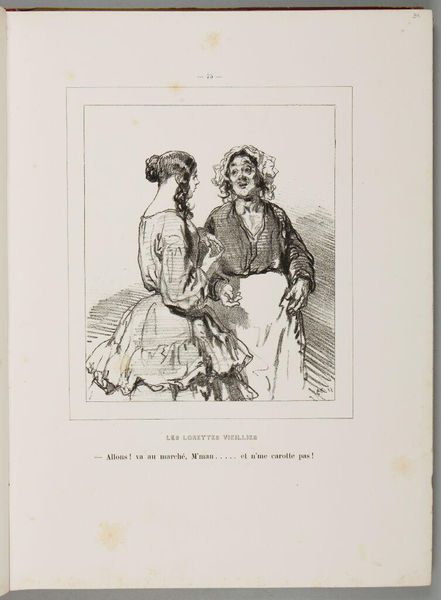 Editor: This is a print by Paul Gavarni titled "Toinon! I'm not worth anything when one harasses me: I know my mind! What a damned knowledge you have there!" from the 19th century. The figures seem tense, almost confrontational. How do you interpret this work in its historical context? Curator: Gavarni often depicted scenes of Parisian life. Consider the social dynamics at play here. The text itself hints at a power struggle. How might the print have functioned as a form of social commentary or critique? Editor: It feels like the image challenges societal expectations and constraints placed on women in that era. Curator: Precisely! Prints like these circulated widely, shaping public opinion and challenging dominant ideologies. By understanding its distribution, we get a clearer understanding of its public role. Editor: I see it now. It makes me think about the role of art in social discourse. Curator: Exactly. And, critically, how access to art was itself a political act.