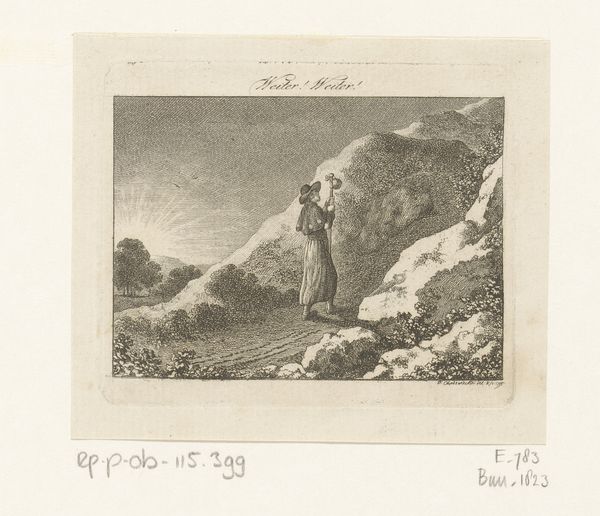 Editor: This is "Pilgrim Entering the Mountain Path" by Daniel Nikolaus Chodowiecki, created in 1794. It’s an engraving. I’m immediately drawn to the contrast between the radiant sun and the shadowy mountain; it’s quite striking. What do you see in this piece? Curator: Intriguing observation. Notice how the composition divides almost equally into light and dark fields, each holding its own distinct texture. The sun, a burst of meticulously engraved lines, sharply contrasts the dense, almost chaotic, cross-hatching that defines the mountainside. Editor: Yes, the detail is amazing for an engraving! How does the figure of the pilgrim function within that structure? Curator: Precisely. Consider the pilgrim's placement. Situated at the convergence of these contrasting spaces, the figure serves as a visual mediator. Its verticality mirrors the staff, thus subtly opposing the horizontal thrust of both the rising sun and the mountainous terrain. How might this axial tension inform your understanding? Editor: I suppose it adds to a sense of the pilgrim’s journey being a challenge, an upward struggle? But what’s interesting is the lightness of the etching – it almost feels hopeful. Curator: Indeed, and reflect upon the Romantic interest in landscape not merely as scenery, but as a mirror to the human soul. Note, for instance, that the eye is encouraged to enter the pictorial space and proceed towards the rising sun along with the pilgrim; however, that is accomplished in carefully controlled graduations that take place from fore to mid-ground! Editor: That’s fascinating, how the formal elements really do guide your experience. Curator: Yes. Paying such close attention to the line, the form, the composition, these details reveal so much. One begins to see this work not just as a simple depiction, but as a study of contrasts that represent much more! Editor: I see that now. It really is more than just what’s on the surface. Thanks!