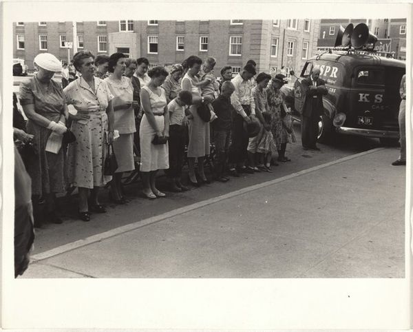Curator: Ah, what a striking image. Robert Frank’s "Woman in costume, parade--San Francisco," snapped in 1956. A gelatin silver print, catching a moment frozen in time. Editor: My first thought? It's pure theater, a stage play in a single frame. The contrast! The flamboyant woman, all furs and feathers, against the backdrop of those young women waiting. Curator: Frank, you know, he was always chasing that friction. That collision of worlds. He wanted to get under the skin of America and to reflect on a reality which wasn’t being captured elsewhere. Editor: Yes, the framing is wonderful in that pursuit. I keep returning to how Frank contrasts texture—the coarse city backdrop playing against the feathery extravagance of the central woman. It lends her a kind of defiant grandeur. What do you think? Curator: Absolutely. There’s a sadness here though, don't you feel it? She seems so exposed, so alone, almost desperate for the spotlight amidst the plain normality. It's an examination of cultural clashes. It's Robert Frank showing that America isn’t that fairytale they are making it to be, and capturing some realism. The title of The Americans couldn’t be any better for a title to depict reality of this new found world. Editor: I see the quiet unease. And look at the composition, it emphasizes that. How the perspective squashes everyone into one visual plane; no escape from this parade. Also notice the “No Parking” sign! The arrangement of those young women, their placement is brilliant. There's nothing accidental about that grouping. Curator: That sign. Exactly. It symbolizes so many social expectations back then; regulations on personal freedom, how society was, and is. What it should and shouldn’t do. What did those women make of that time? That particular parade. Did they embrace the time, did they follow trends and make them of their own, or did they resist? One thing is certain, there’s much there. Editor: The picture becomes richer the more you contemplate those questions. It encapsulates an era's dreams, frustrations, style, and silent rules, a beautiful tableau brimming with unspoken dialogues. What an achievement by Frank. Curator: Indeed, the artist captured what wasn’t told. A single frame is a symphony, humming with the tune of an untold story. What a magnificent display from him, showing not the glory but rather the underbelly, capturing a moment within which to reflect upon ourselves.