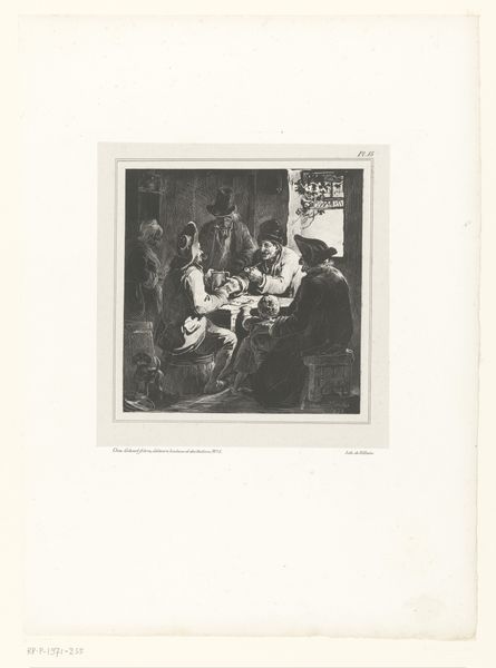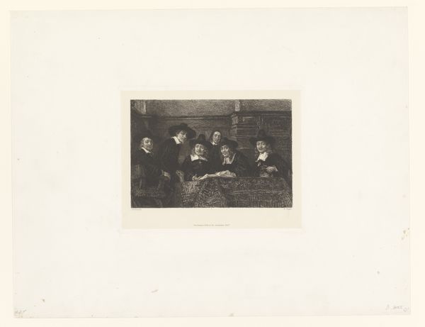 Curator: Here we have "Zittende mensen bij een kerkdienst", which translates to "Seated People at a Church Service," an etching from 1880 by Antonio Piccinni. Editor: My first impression is one of quiet solemnity. The subdued palette, the posture of the figures—it speaks volumes about societal expectations for women in religious spaces during that time. Curator: Absolutely. And I think we can extend that consideration. Etchings, especially those depicting everyday scenes like this one, were often circulated as prints in newspapers and magazines. They allowed for the wider dissemination of particular views of life. In this case, the piece acts almost like a photograph. Editor: True, these women are placed in an institutional framework and observed. The image evokes themes that are common across 19th century Western representations of women. It depicts piety, mourning, but also possibly boredom and a restricted life. It raises interesting questions about female agency. Curator: And how does this fit into the trajectory of Academic Art that influenced this work? The attention to detail, the realism – all reflect prevailing aesthetic values. Consider also the composition: the women are clearly delineated, each rendered with distinctive features and garb. Their class status seems equally evident. Editor: And what’s the role of religious institutions, depicted in such artworks? Churches not only provided a spiritual framework, but reinforced social norms and hierarchies. Consider, who's present and seemingly emphasized in the work, versus those conspicuously absent, and what power dynamics do you start seeing? Curator: Those are excellent points. The setting becomes less a place of solace and more a stage upon which roles are performed. In many ways the artist is capturing, whether intentionally or not, the nuances of gender, class and even religion. It reminds me of related societal expectations outside of just the Church's parameters as well. Editor: Right. And how were women able to push against this constrained public imagery through resistance or activism during this time period? Who got to produce and circulate this type of images versus whose voices and images were suppressed? The artist had power here, so it makes sense for us to question the ethics and intention. Curator: This piece has led to many different considerations regarding social contexts, public art and art history. Thank you. Editor: Agreed, analyzing this print, it opens more doors into considerations around representation and its impacts, making visible both conscious and less conscious social frameworks.