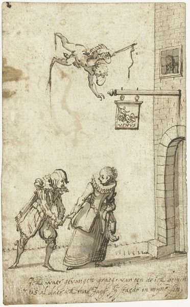 Harmen ter Borch created this dynamic drawing, "Chariot and Rearing Horse," with pen in brown ink. The immediate visual impression is one of tension and imbalance, created by the rearing horse teetering above the chariot. Borch captures a moment of instability that evokes both excitement and precariousness. The composition balances the detailed chariot at the bottom with the more freely rendered horse above. This contrast highlights the themes of control versus wildness, structure versus spontaneity. Note how the geometric precision of the chariot's wheels and the decorative pattern contrast sharply with the horse's mane, its lines suggesting raw energy. The texture of the aged paper further enhances the sense of history and the passage of time. In essence, the drawing challenges fixed meanings. The horse resists the chariot’s direction, and the artwork becomes a site of ongoing interpretation.