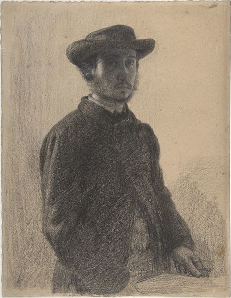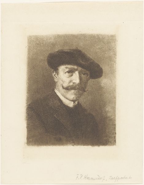 Editor: This is P.S. Krøyer’s self-portrait, created as an etching in 1898. The monochromatic palette gives it an intimate, almost vulnerable feel. What social or artistic context might have influenced Krøyer to depict himself in this way? Curator: That's an astute observation. Consider Krøyer's position within the artistic and societal currents of the late 19th century. He was deeply embedded in the Skagen artistic colony, which celebrated naturalism and plein air painting. Yet, this etching, made during a period when Krøyer was struggling with mental illness, offers a strikingly different narrative. How might his personal struggles relate to the public image he cultivates through art? Editor: That’s interesting. It feels almost contradictory, right? This almost romantic artistic movement with his deeply personal battle. Did the art world grapple with the representation of mental health at the time? Curator: Precisely. Mental illness carried a considerable social stigma. His choice to create and exhibit this self-portrait is potentially a radical act, challenging prevailing norms. Do you see this work as solely an introspective look or also potentially a comment on the accepted visual language for representing artists, and perhaps, humanity itself? Editor: I see what you mean. I was so caught up in the face value, in it being a self-portrait, but that almost restricts what I was willing to look for beyond that initial thought. I’ll need to spend more time looking beyond that now! Curator: And that’s the essence of historical inquiry. It's about questioning, contextualizing, and understanding the multilayered dialogues art creates with society. I will definitely ponder more on the potential subversiveness in revealing vulnerability through a "public" act of art, the self-portrait.