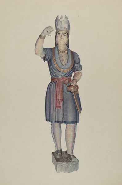 Editor: Here we have a watercolour from around the 19th century called 'Musician', author unknown. It depicts a person holding what looks like a small horn. The colors are so striking; particularly the bright blue of the central figure’s clothing. It's captivating! What’s your take on it? Curator: Ah, yes. This piece draws me in, makes me want to invent stories! Notice how the artist teases us with detail and flat planes. Look at the eyes – such character in them! But then the hands – almost like little paddles! And is that horn really a horn? Perhaps it’s a tiny, elegant perfume bottle she’s coyly offering, what do you think? Editor: A perfume bottle! That's a cool reading. I was thinking it looks a little bit like those hunting horns used for calling dogs. Curator: Maybe you're right; what a funny twist! The miniature style often carries that playful sense of irony. But notice, too, how her slight elevation suggests her elite place in society, how her stance appears timeless! Are we seeing reality or a theatrical stage? That’s what lingers for me. It’s as though I'm catching a glimpse into a rich fantasy. Editor: I like that. A rich fantasy - it definitely has a stage-like quality to it, everything seems carefully constructed. It’s made me appreciate miniatures a bit more too. Curator: Me too, this playful miniature really stirs my imagination every time.