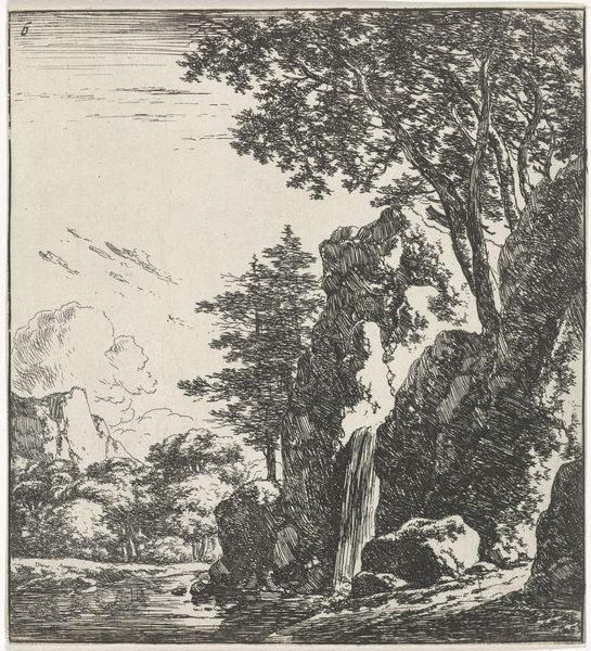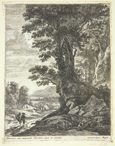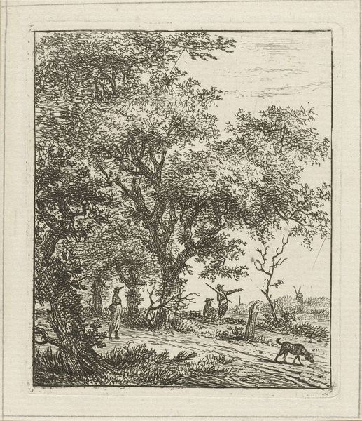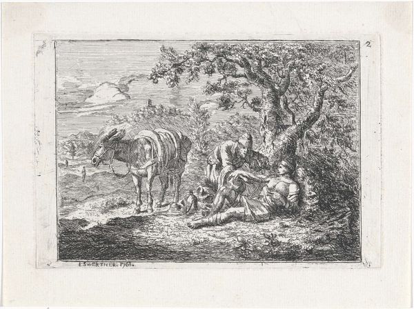 Curator: Well, look at this intriguing slice of life captured by Hendrik Godart de Marée between 1752 and 1783! The title, "Pakezel op landweg met zich ontlastende man" suggests it's... earthy. Editor: Earthy is an understatement. My first thought: awkward! An ordinary donkey with a loaded pack, juxtaposed against... that. It certainly grabs your attention. A man relieving himself... it’s bold. Curator: Exactly! It’s a genre painting captured through the crisp lines of an engraving. I mean, landscape in the Baroque style, but with this stark realism breaking through. The artist really had a thing for balancing nature with the frankly unavoidable realities of being human, didn’t he? Editor: There's something fascinating in immortalizing this mundane, often taboo act. Historically, the simple act of excretion has so many meanings, ranging from fertility rites to even warding off the evil eye! Did the artist purposefully select a donkey as well as an ironic image reflecting stubbornness as a base instinct of burden as part of being, also revealing himself at the root of all. The barrel above perhaps showing all you drink and eat, has to go somewhere eventually! Curator: Interesting, I had simply viewed it as quite literally, the shittiness of existence we're carrying along! Though, a lot of that nuance would certainly be missed by a modern audience lacking the contemporary iconography, eh? I love the tree though. I’m thinking how it anchors the composition, yet its dark foliage partially conceals this bloke in his moment... it is a complex dichotomy indeed, a push and pull that emphasizes the themes in place here of the figure against an open-yet-secluded landscape. Editor: Concealment and revelation are the key here. It reminds us that the everyday, the primal, always exists, often hidden in plain sight, in contrast with the conventional, pristine landscapes. But still with his ass right there exposed. He is not a figure or face to make a comparison. His is as anonymous, as invisible as we pretend the act to be. Curator: Invisible is arguable when hung in a gallery. Editor: True, true, that's how memory, or rather recognition, functions! Now it carries meaning for all that witness! That’s where art transcends reality. A candid bathroom break captured, an ode to existence if you will. Curator: Wonderful—now that's something to chew on as we stroll onward. Thanks for, ahem, lightening the mood!