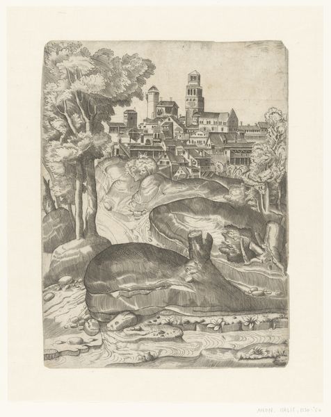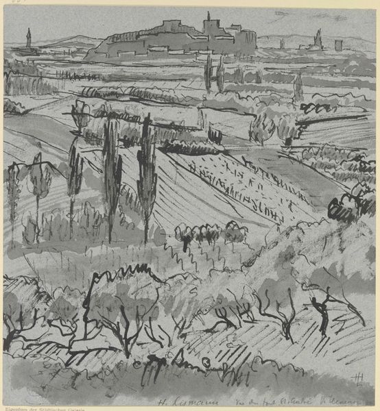 Curator: Right, let’s immerse ourselves in this cityscape—it’s Joseph Pennell’s etching of San Gimignano, crafted in 1883. It is a captivating drawing rendered in ink. I wonder what impressions arise for you. Editor: At first blush, there’s a melancholy romance to it. The towers reaching towards a sky that seems both vast and burdened. It’s like a memory trying to hold onto something ancient and beautiful, before it all fades. Curator: I can sense that sentiment in the image too, absolutely! Towers piercing the sky, yes, each one seemingly asserting its place. Pennell really captured that vertical thrust against the rather softly rendered, almost melting landscape. They serve, still, as watchtowers, their existence forever embedded in the heritage of their locations. Editor: It’s interesting to me that you bring up them serving as watchtowers since these towers do stand as phallic symbols which would imply safety, leadership, and patriarchal societal expectations for the generations living around the towers in question. Curator: That’s interesting—but how do we balance what Pennell might have consciously been trying to convey versus what deeper, almost primal, resonances these architectural shapes evoke? Perhaps it’s both! What do you sense in the details, those little visual choices Pennell made? Editor: The foliage in the foreground seems intentionally loose and unkempt, almost like a curtain veiling the fortified settlement, and also suggesting vulnerability of those living on that side of the hillside near the settlement. Perhaps it reveals that vulnerability more by making the choice of that foreground in comparison to the solid, secured settlement, Curator: That sense of the natural world framing human endeavors, almost like life is growing *around* those imposing structures. In terms of pure aesthetic delight, what really gets me is the sheer textural variety he achieves just through etching. He conjures everything from rough stone to almost silken leaves. Editor: Indeed! The symbolism coupled with technique, renders it more potent. I keep thinking of how human ambition perpetually seeks to transcend mortality, but inevitably the weight of time, culture, expectation and history bear down on any form that arises from our existence. This image captures both of these warring aspects so profoundly. Curator: Ultimately, then, perhaps the charm of San Gimignano as revealed by Pennell is not just the buildings, or even the time period, but rather this quiet moment where art allows the conversation between past and future, ambition and decline, all within the framework of one hillside to gently whisper through the ages. Editor: Precisely. It reminds us of art's uncanny ability to become more than just a document; a living, breathing echo.
