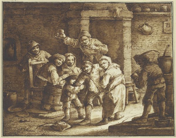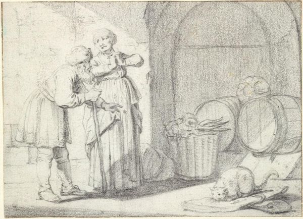 Editor: So, this is "Fabel van de twee muizen" from 1567, an engraving by Marcus Gheeraerts the Elder. It's at the Rijksmuseum. The detail is incredible! I feel like I'm peeking into someone's cellar. The whole thing has a kind of dark, industrious feel to it. What jumps out at you when you look at this piece? Curator: Ah, a glimpse into a world both familiar and strange. My eyes dart around this meticulously etched space. Barrels crowd the scene. And you're right, it is that contrast, isn't it? A slice of daily life rendered with almost obsessive detail...but then, those *mice*. Don’t you think the man with the candle seems a little too oblivious? Editor: He really does! Almost comical. I mean, he's right there, and they are having a feast. It is a fable so does that make them stand for something? Curator: Precisely! Gheeraerts is offering more than just a genre scene. The mice, gorging themselves under the unsuspecting gaze of the cellarman – it's a classic fable setup. This engraving whispers of hidden truths, perhaps about complacency or the imbalance of power. You see the folly, the near blindness. Consider, were viewers laughing with the cellarman, or *at* him? It's unsettling and strangely funny, no? Editor: Definitely unsettling, now that I think about it. It is darkly funny though, like a silent joke being played. Thank you! Curator: My pleasure! I’ll be pondering those mice for a while. The world looks different when you wonder about unseen eyes.