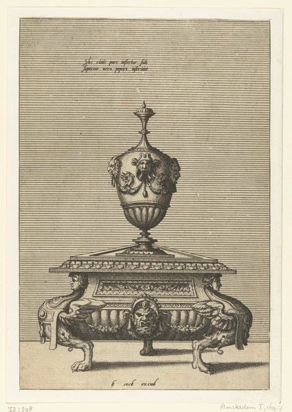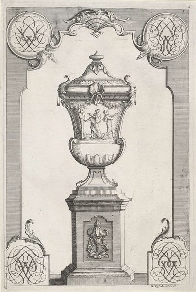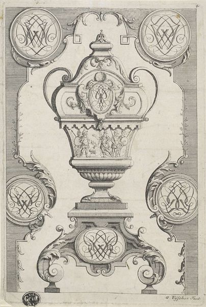 Editor: Here we have “Vaas,” an engraving by P. Nicolet from 1771. It depicts a rather ornate vase in the Baroque style. It's fascinating how much detail the artist was able to achieve with just simple lines! What's your take on this work? Curator: My attention immediately goes to the process itself. The creation of such detail via engraving speaks volumes about the artisan’s labor. How was this print likely used and distributed at the time? Considering the level of detail, who was the likely audience? Editor: Good question! I imagine something like this would be a study piece for aspiring craftsmen? Curator: Precisely. Engravings like this were often circulated among workshops and patrons, influencing design and taste. This blurs the lines between “high art” and craft; this print isn't just art, it's a blueprint reflecting and shaping contemporary material culture. Look closely at the vase’s handles, adorned with vines and that rather grotesque mask. Editor: Yes, the details around the mask feel very intentional, like a maker showing off skills. What kind of impact do you think this had on the making of actual objects? Curator: These kinds of prints standardized certain aesthetic trends. Artisans referenced and reinterpreted details like the foliage or the shape of the vase, popularizing these forms among consumers, who saw similar design elements translated to various functional objects, and the prints themselves, which, remember, were also commodities. So what does that make us consider? Editor: I see now; the print becomes part of the cycle of production and consumption! This puts into perspective that something as seemingly simple as this engraving could play an active role in broader design. Curator: Exactly. Understanding its creation and function enriches our understanding of 18th-century material culture far beyond its aesthetic value.