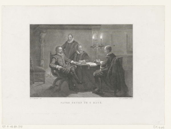 Curator: Right, let’s immerse ourselves in this gem from the Rijksmuseum, a work titled "Vrouw brengt een baby in een mand binnen," which translates to "Woman Bringing a Baby in a Basket Inside." The artwork, rendered between 1751 and 1816, is credited to Reinier Vinkeles. The technique appears to involve pen, graphite, and drawing—altogether giving off neoclassical vibes. Editor: My first impression? This has all the warmth and hushed secrecy of a Vermeer interior. There's something profoundly intimate about this everyday scene. The almost ghostly illumination adds such mystery. Curator: Absolutely. Genre paintings, such as this one, capture everyday life. You’ve nailed the atmospheric quality with your comment about the light. The candle's presence isn't merely functional; it symbolizes something. I wonder, what does it evoke in you? Editor: Hmmm…Candles often represent illumination, of course, but also vulnerability. It suggests that whatever's happening, whether good or bad, is unfolding under delicate circumstances. Perhaps secrecy plays a large role. After all, this bundle is delivered under the dim light, accompanied by secretive onlookers, suggesting a covert act. Babies, being fragile symbols, have many meanings…but in the dim, everything is about a clandestine delivery. Curator: That covertness is precisely the thread I was about to grasp, yes. Notice the woman in the doorway; she almost seems to fade into the wall, aware she is not part of the inner sanctum. But what's she bringing in the basket? Editor: Oh, it’s a newborn child, of course! Talk about being thrust into the world—a rather secretive and somewhat tense one. The characters in the interior definitely are on guard; someone doesn't welcome the bundle of joy! Curator: And yet, in the heart of it all, there is life being ushered into a family's world…a reminder that narratives are rarely simply black and white. Editor: Nicely put! There's this duality playing out. A simple family tableau, yet it feels weighty with unspoken stories, rendered with such neoclassical elegance. A bundle of contradictions, gently presented, isn't it?