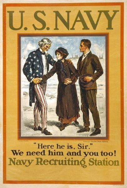 Curator: Look at this striking poster! Charles Dana Gibson created it in 1918. It's called "Help! The Woman’s Land Army of America." It was actually used as a recruitment poster during World War I. Editor: Wow, immediately I get this sense of collaboration and urgent need, that this poster transmits this incredible mix of patriotic duty and respect for women’s labor. The handshake seems so formal yet powerful, promising and calling people for help. Curator: The imagery is so loaded. We have Uncle Sam tipping his hat, shaking hands with a woman representing the Land Army. In the background, there's almost a ghostly gathering of soldiers and flag-bearers fading. How do you interpret these visual components? Editor: For me, Uncle Sam removing his hat is key, because in itself this simple action represents how social conventions are evolving under the pressure of the historical event. This salute is not just a symbol, it shows how cultural identities are negotiated within contexts that redefine societal expectations. Then the woman's uniform with the hoe, really emphasizes her active, working status. But that ghostly image behind them reminds of how delicate and transient everything is, and puts pressure over women’s work in these dark times. Curator: That’s a powerful way to interpret the visual balance. You’ve hit upon the poster’s psychological strategy of cultural memory and promise. I also note the compositional arrangement uses very economical means. The direct, clear colors, the forceful text: it needs to grab you immediately with no messing about. There’s the acknowledgement "Until the Boys Come Back" clearly conveying women filling vital roles while the male workforce is at war. Editor: Yes, this really stands out in our memories, and the image makes us reevaluate social constructs in relation to wartime roles, while underscoring female contributions during a crucial period in our history. Its influence is indelible. Curator: Definitely food for thought! Thank you.