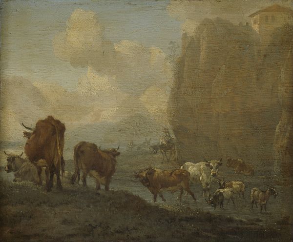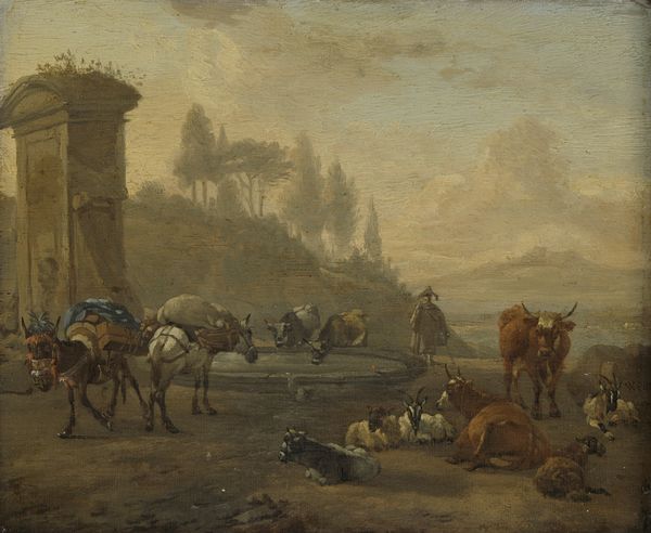 Editor: This is "Italian Landscape with Soldiers," an oil painting attributed to Karel du Jardin, sometime between 1652 and 1700. The crumbling ruin in the background gives it this feeling of past glory and faded empire. How do you read this scene? Curator: Well, immediately I think about the intersection of power and representation in landscape art. Here, the pastoral scene isn't just a pretty backdrop; it’s a site loaded with social and political meaning. Notice how the soldiers aren't engaged in heroic battle, but seem more like guards overseeing a working landscape. Editor: So, you're suggesting that the painting isn’t just a peaceful scene, but also says something about control? Curator: Precisely. And who are they controlling? The animals, yes, but also, implicitly, the land and its resources. This kind of scene served to naturalize and legitimize a certain power dynamic. Consider the visual hierarchy: The ruins of Roman power in the distance, the military figures in the midground and in the immediate foreground. Editor: It's interesting how it frames the Italian landscape through the lens of military presence, instead of celebrating its natural beauty. Curator: It really invites us to question what this idealization of nature obscures, perhaps social inequalities or even exploitation of natural resources. Du Jardin doesn’t offer us pure beauty, but a carefully constructed image, one embedded with implicit social commentary. Editor: So much more to landscape painting than initially meets the eye. I'll never look at another landscape the same way again! Curator: That's exactly the point—to look beyond the surface and ask, "Whose story is being told, and whose is being left out?".