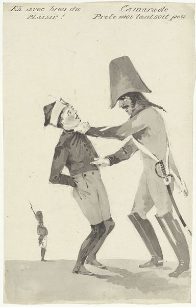 Editor: So, this lithograph, "Usant jusqu'a son dernier homme..." by Honoré Daumier, dates to around the 19th century. It's a striking image, a powerful man towering over a diminutive figure. What's your take on this print? Curator: For me, this image screams about production. Think about it: the process of lithography itself – the labour, the stones, the printing presses. And then there's the subject. It shows us hierarchies of labour. Who profits from this system? Editor: The text mentions the last man and the last musket… it suggests a kind of exhaustion? Curator: Precisely! Consider the musket, a mass-produced object of war. Daumier isn’t just showing us the "last" of something; he's commenting on a society that consumes people and resources until nothing is left. It’s a critique of the political machine grinding down its populace. Look at the figure’s exaggerated features, is it perhaps critiquing the very elites who propagate these endless cycles? Editor: That's interesting, the figure as a kind of personification of relentless production, right? It feels less about individuals and more about systems. Curator: Absolutely. It prompts us to think about who controls the means of production. Daumier’s choice of lithography as a medium makes this critique all the more potent. It’s accessible, reproducible… mirroring the cycle of consumption he critiques. Editor: I never really thought about prints in terms of labor before, this completely changes my view! Curator: Art isn’t just about what is depicted, but *how* it is made and who benefits in that production process!