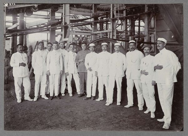 This anonymous photograph, "Groepsfoto opzichters," resides here in the Rijksmuseum. It’s a study in whites and greys, a monochromatic process that feels almost like a drawing, where light and shadow do all the work. Look closely at the textures, the way the light falls on their crisp, white uniforms against the muted landscape. There's a starkness, a kind of bleached clarity that drains the color, leaving a residue of tones that feels both distant and immediate. Notice the small watch chains that each of the men are wearing. Their repeated placement in each figure feels almost decorative, but these are working men, not peacocks. This reminds me a bit of some of the work of Bernd and Hilla Becher, the way they obsessively photographed industrial structures. There is something about the nature of the photographic process itself, the way it reduces the world to a series of tones and textures, that speaks to the way we make sense of the world around us: an endless conversation across time. It's an invitation to bring our own experiences and interpretations.