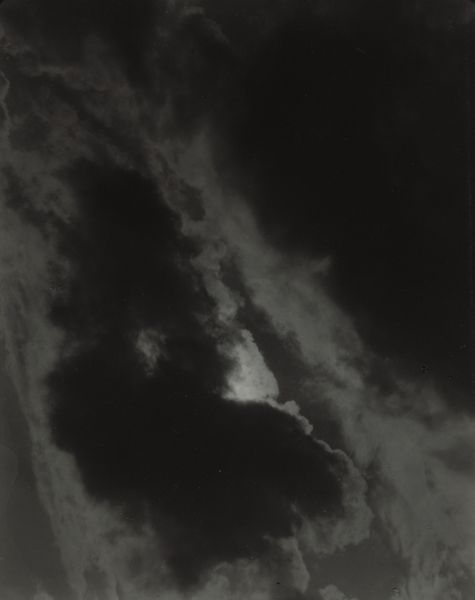 Curator: Before us, we have Alfred Stieglitz’s 1931 gelatin silver print, "Equivalent." Editor: Striking. There’s an immediate, almost overwhelming sense of ethereality…of transcendence. Is this the sublime I feel? Curator: It is cloud formations that occupy our view; but it's the interplay of light and dark, the gradient tonality achieved through the gelatin silver process, which gives the work its potent abstract quality. Editor: Clouds often represent transformation, spirituality, perhaps a link between the earthly and the divine. Do you think Stieglitz chose this subject intentionally to convey deeper meaning? Curator: Doubtless, and to demonstrate his skill! The strategic composition is masterful. Notice how the diagonal thrust of the cloud formations pulls the eye upwards and outwards, almost defying the rectangular format of the print. The texture feels simultaneously chaotic and carefully orchestrated. Editor: It’s almost primordial, calling forth images of creation myths. It feels symbolic. In looking at this landscape, Stieglitz perhaps encourages us to search for what lies beyond literal depiction. It hints at other worlds... or perhaps a different state of consciousness. Curator: That's precisely it! By decontextualizing these ephemeral formations, Stieglitz allows for an interpretive experience. The clouds become stand-ins, allowing us a visual form with which to understand an immaterial process. The drama lies in the range of the values—the high-key areas contrasting starkly with the dark, undefined spaces. Editor: It strikes me as almost... hopeful. The light breaks through what seems like the encroaching darkness. Maybe this photo becomes a metaphor for finding light during times of strife. Curator: I find it difficult to disagree, though the hope, if we choose to call it that, is constructed from formal strategies—the luminosity achieved by carefully managed development, and that brilliant tonal range we've discussed. Editor: It does give a new appreciation for the power and the symbolism found in something as everyday as the shape of clouds. Curator: Indeed. An artwork isn’t always about its literal subject, but rather about how the aesthetic and compositional elements can inform meaning, regardless of what that form looks like!