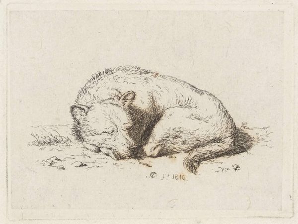 Jan Dasveldt’s drawing depicts a resting cow. The subdued palette of neutral grays and browns creates a placid, almost melancholic atmosphere. The composition focuses on the bulky form of the animal, filling the frame with its mass. Dasveldt's skillful rendering of light and shadow models the cow’s body, giving it a palpable, almost sculptural presence. The lines are delicate and precise, capturing the texture of the cow's hide and the subtle contours of its anatomy. The choice to portray the cow at rest invites contemplation on rural life, the pastoral tradition, and the natural world. By focusing on a subject so integrated into the landscape, Dasveldt's work reflects the broader cultural interest in nature. The drawing provides a glimpse into the relationship between humans and animals, revealing a sense of harmony and mutual dependence. The image, simple in its subject, opens up a rich field of interpretation.