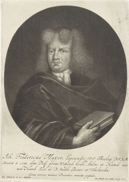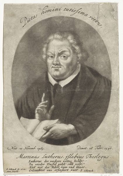 Editor: This is "Portret van Martin Luther," a print from somewhere between 1700 and 1750 by an anonymous artist, exhibiting Baroque influence and a definite air of the 19th century as well, through the Old Engraving Style, it seems to me. It looks pretty severe. How would you interpret this portrait in its historical context? Curator: This print is not just an image; it's a piece of propaganda. The way Luther is presented—that resolute gaze, the hand resting on what appears to be a bible, but it is difficult to know for sure—all contribute to a carefully constructed image of the reformer as a steadfast figure. What does it tell us about the time this print was produced? Editor: That's interesting, I hadn’t thought of propaganda. So, it’s made much later than Luther’s life? I suppose, that suggests the Reformation's influence was still politically relevant well after Luther's death and maybe connected to conflicts later on? Curator: Precisely. Prints like this circulated widely, solidifying Luther’s image and promoting particular ideologies long after the Reformation itself. Think about the role of these images in shaping public opinion. Are they neutral historical records? Or active participants in ongoing debates about religious and political authority? The printing press, you know, became central. Editor: That’s a good point. It wasn’t just a reproduction, but actively constructing an idea of Luther, so his ideas had long lasting repercussions and remained poignant to society. This makes you think about the use of images in museums, who they include, and why. I hadn't fully thought about the influence of art, as it became a way of actively propagating different religious ideas at different periods in time. Thank you for your time.