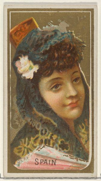 Curator: What a striking image. This is a card from Allen & Ginter's "Types of All Nations" series, dating back to 1889, and it depicts a personification of Syria. Editor: The details are gorgeous, it almost glows. But it’s got an aura of 19th-century orientalist fantasy, don't you think? Curator: Absolutely. It's fascinating to consider that these cards, distributed with cigarettes, played a role in shaping popular perceptions of different cultures. Consider the printing process here: lithography allowing for mass production and wide distribution, contributing to a homogenization and idealization of the "exotic Other." Editor: Exactly! And the "types" classification itself reveals how these images were used to essentialize entire nations. What socio-political messages do these material objects convey and legitimize about the depicted Syrian subject? I wonder, how were Syrians being represented back home at the same historical moment, using, say, the newly established media of photography? Curator: Good point! These cards served to reinforce imperial power dynamics. They packaged and sold the world in easily consumable images. Editor: And that commodification extends beyond just representation. It implicates material conditions: labor, the use of resources...who profited from this image, and under what conditions? Was the model compensated? Curator: The very creation and distribution are implicated in global economies. The sourcing of paper, inks, the transportation networks used… the card is a node in a much larger system. Editor: The symbolism chosen and details included contribute to its complex context. Is the outfit she's wearing traditional? How much creative freedom did the artists employ in imagining Syrian dress? Curator: These "types" aren't faithful reflections. This card, as a commercial product, needed to conform to prevailing consumer tastes. It needed to "sell" the idea of Syria in a palatable, readily understandable form for its audience. Editor: This isn’t an unbiased window into Syrian culture. It tells us more about Western expectations and biases at the time. It seems that this collectible both reflected and manufactured fantasies around non-western people and lands. Curator: Yes, definitely. It's a beautiful object, a fascinating product of its time, but certainly loaded with historical complexities. Editor: A pocket-sized object lesson in the visual construction of identity and power!