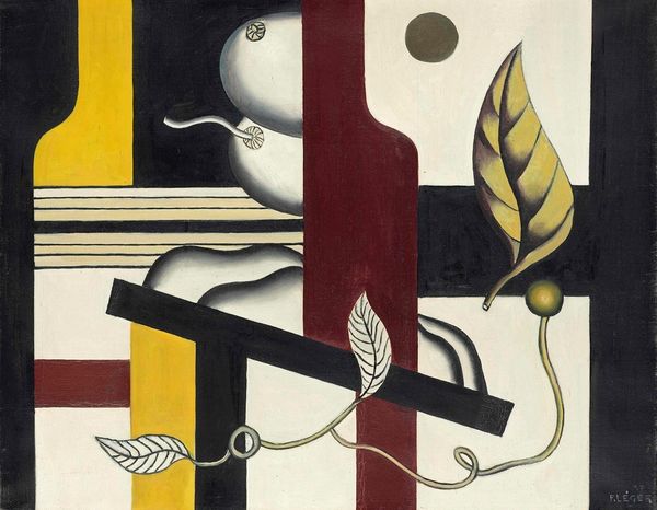 Fernand Léger painted 'Le profil noir' with oil on canvas, and it’s a painting where form feels like it's been distilled to its essence, where every shape and color is deliberate, precise, like building blocks in a visual puzzle. The surface has this cool, industrial smoothness; you can feel the artist’s hand but it’s like he's trying to hide the evidence of touch. The black profile itself is so solid and absolute, yet right next to it, there’s this hazy, atmospheric gradient. It’s like Léger wants to give us something solid, something sure, and then immediately undermine that certainty. Look at how he uses these straight lines and geometric forms, but then throws in these organic shapes, like the leaves and fruit, softening the whole thing. Léger was always looking at machines, at the modern world, but he had this deep love for the human figure, and in his work, you see a way he brings those two things together. There’s a bit of Picasso in the way he breaks things down. But Léger's got his own rhythm, his own way of singing the song of the machine age.