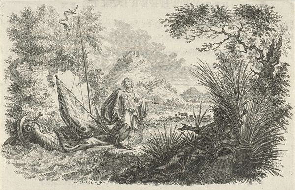 Curator: Immediately, I’m struck by the sharp contrasts in this engraving, the fine lines creating a really dramatic effect. Editor: Indeed. This is a proof print from 1863 titled "Prøvetryk til Chr. Winthers A.B.C." by H.P. Hansen, intended as an illustration for Christian Winther's alphabet book. It’s currently held at the SMK, the National Gallery of Denmark. What’s most interesting here is the fusion of art historical context with intended functionality of print. Curator: Functionality being key. Looking closely, you can see the labour that has gone into creating such intricate detailing through etching on metal, with the purpose of producing something that could be reproduced at a potentially wide scale and distributed widely. A child’s learning tool of that era becoming now high art behind glass. Editor: Absolutely. Hansen clearly pulls from prevailing attitudes in representing Egypt—through familiar cultural representations. I mean look, the pyramids are there, even stylized versions of hieroglyphs are hinted at through the landscape, contributing to the perceived "Oriental" narrative familiar to the western gaze of the time. Curator: Yet, it's also interesting to look beyond the immediately identifiable narrative or symbols into how materials themselves convey meanings. Consider the choice of etching technique versus, say, painting: what are its economic and practical ramifications within the context of mid-19th century production means? It allows multiple renditions as opposed to a unique painting. Editor: Certainly, the implications of accessibility is also important here, considering its function as didactic imagery intended for a child audience of the rising middle class, what political messages were communicated through popular prints available? Curator: Well, this particular print definitely urges questions surrounding production, purpose and worth within historical contexts... I think it reminds us of the importance of investigating the practical making of art. Editor: For me, it reveals the complex layers of social commentary often embedded within what might initially appear as simple imagery in educational material.