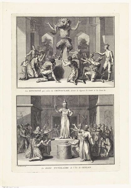 Curator: This engraving, made in 1791 by Jacob Folkema, presents two scenes, each rich in religious symbolism. The print, held at the Rijksmuseum, is titled "The Four Evangelists and Gabriel Appears to Zacharias." Editor: My first impression is of stark contrast and ethereal weightlessness—that visual dichotomy, enhanced by the line engraving on paper, sets a very interesting mood, don’t you think? Curator: Absolutely. The upper scene, depicting the four evangelists, seems to float on clouds, each accompanied by their traditional symbolic animal. There's Matthew with the angel, Mark with the lion, Luke with the ox, and John with the eagle. These are powerful archetypes representing different aspects of Christ’s ministry. Editor: Right, and if you consider the labor-intensive process of engraving, meticulously carving those lines into a metal plate and then transferring the image to paper, the contrast intensifies the divine message through artisanal craft. Each strike of the burin imbuing it with meaning. Curator: Indeed. The lower scene shows the Archangel Gabriel appearing to Zacharias in the temple, announcing that his wife, Elizabeth, will bear a son, John the Baptist. The temple is rendered with an almost geometrical precision. It conveys a sense of divine order imposing itself upon the mortal realm. Editor: Yes, and it is the starkness of line, the absence of color—it really directs focus to the architecture. It emphasizes the social context: a clear articulation of space and its function. The production constraints, paper, burin, printing press all force the message into stark, graphic terms. Curator: Folkema is employing a traditional symbolic language, translating scripture into a visual vocabulary understood throughout the 18th century, continuing iconographic traditions. Each character, each gesture, contributes to the overarching narrative. Editor: Agreed, and that tradition speaks to the very act of production, as this artwork emphasizes the crucial interaction of labor and its tools to deliver complex meaning. These religious scenes gain further nuance if considered as constructed artifacts. Curator: Considering both form and content illuminates the cultural continuity embedded within these images. Thanks for drawing attention to these subtleties. Editor: And thank you for highlighting the powerful and persistent resonance of this engraving’s iconic symbolism. It highlights the power of craft itself!