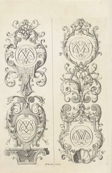 Gerrit Visscher created these two vertical ornaments of leaf tendrils with monograms, using engraving. They are undated. These designs offer a glimpse into the social and cultural values of the time, reflecting the importance of decorative arts in aristocratic society. Looking closely, the symmetrical arrangements, along with the intricate details of leaves, monograms, vases and creatures, would have appealed to wealthy patrons seeking to embellish their surroundings with refinement and sophistication. Made in the Netherlands, the design is rooted in the artistic traditions of the Dutch Golden Age, when decorative arts flourished. The designs' ornate, detailed style is typical of the era's emphasis on wealth and prosperity. To fully appreciate these designs, one might research the context of decorative arts in the Netherlands. By exploring such sources, we can better understand the social and institutional forces that shaped their creation.