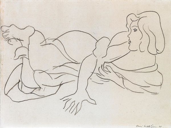 Editor: This ink drawing on paper by Leo Gestel, made around 1931-1933, is titled 'Venus Vignet voor boek 'L'art Hollandais contemporain' van Paul Fierens', which roughly translates to 'Venus Vignette for Paul Fierens' book 'Contemporary Dutch Art'.' It features a reclining nude figure alongside two horses and two doves. The high contrast and bold outlines give it a graphic quality. What symbols and imagery do you notice? Curator: The power of the classical world certainly pulses through this image. Gestel links the idea of Venus, goddess of love and beauty, with symbols of peace and power – the doves, traditionally associated with the goddess, and the horses, emblems of strength and vitality. It almost reads as an exploration of idealized feminine strength in a modern context. Do you see the geometric shapes integrated within the waves? Editor: Yes, I do. The geometric waves contrast the otherwise more fluid lines of the figure, birds, and horses, but I don't see the connection, what is it there for? Curator: These recurring shapes evoke the mechanization and the streamlined aesthetic of the era – the dawning age of machines – intruding upon, perhaps even supporting, the organic world. Consider this interplay: Venus, an emblem of ancient ideals, existing within the rapidly changing landscape of the 20th century, surrounded by a stark simplification of the natural world. It suggests the artist’s perspective on timeless beauty navigating modernity. Editor: So, it's about reinterpreting classical symbols for a modern audience. I initially saw it as a simple nude, but I now understand the deeper conversation about cultural memory and modernity through those symbols. Curator: Exactly! Gestel isn't just representing; he's reinterpreting and asking us to reconsider the emotional and psychological weight these age-old figures still carry. Editor: This makes me want to go seek out more of Gestel's art! I am thankful to know more about what cultural memory has to say to our world today.