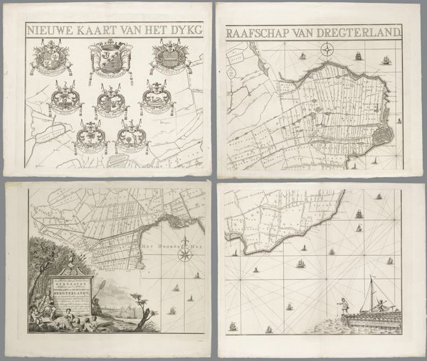 Editor: So, this is "Plattegronden van Puigcerdá, Palamos, Château de la Trinité en Barcelona" from around 1702, an anonymous work from the Rijksmuseum, done in pen and ink. It's a series of maps, and something about the precision of the lines against the backdrop of old-world cartography really strikes me. It's technical, but it also has an artistic quality. What captures your eye in this piece? Curator: You know, these weren’t just pretty pictures; they were strategic tools. Imagine those old fortifications, carefully rendered, designed to project power. Each line and angle dictated by military intention. The anonymous artist becomes, in some ways, a silent strategist, visualizing geopolitical aspirations. Have you ever thought about maps as a form of silent warfare, an assertion of control through representation? Editor: That's fascinating, I hadn't considered that. The level of detail is amazing. Is that typical for maps of this period? Curator: The Baroque loved detail, drama, and grand statements. These maps are very Baroque in their intent. What I mean is not just geographical accuracy, but they serve a sense of possession. Look how the coastlines are almost embraced by the detailed lines. Editor: So, it's not just about showing where things are, but claiming them visually? Curator: Exactly! Consider that "Château de la Trinité," nestled against dramatic mountains. It’s not just a fortress, but a visual statement of dominion over a landscape, almost romantic in its possessiveness. Does it make you see maps in a different light now? Editor: Absolutely! I never considered the power dynamics embedded in something that seems so factual. Now I see stories of ambition and control just etched into these coastlines. Curator: And that, my friend, is how a seemingly straightforward map transforms into a profound piece of historical commentary. I love when art can reveal a hidden perspective!